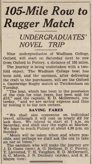In the inter-war-years, in particular, rowing eights from Oxford to Putney was not uncommon. The Belfast Telegraph said of the 1932 Wadham effort, ‘Yet another Oxford college eight is rowing down from Oxford to London at the end of term’. The Nottingham Evening Post wrote, ‘The fashion of rowing (from Oxford to London) has come into vogue in recent years…’ Despite this, and perhaps because December is usually a ‘slow news’ month, Wadham’s row was well covered by the press and even a cinema newsreel got involved with a film titled “Oxford to Putney. A Long Pull! Wadham College Boat Crew row the 104 miles in 16 rowing hours”. Watch it here: