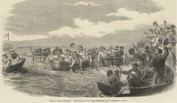 For many interested in rowing history it is sometimes necessary to remember that, in times gone by, rowing for pleasure in Britain was not just confined to well-organised groups of ‘gentlemen amateurs’ in clubs in and around London or at a few universities – as these corn porters engaged in the ‘shovel race’ at Kings Lynn Regatta in Norfolk in 1864 demonstrate.