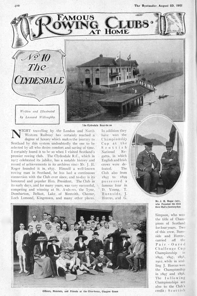 Clydesdale Amateur Rowing Club was founded in 1857, making it only one year younger than London RC but older than many ‘Grand Old Clubs’ such as Thames, Molesey, Kingston and Marlow. Since its current boathouse was built in 1905, Clydesdale has occupied one side of the building and Clyde ARC (est. 1865) has boated from the other half.Page 1 of Willoughby’s article on Clydesdale ARC.Page 2 of Willoughby’s article on Clydesdale ARC.