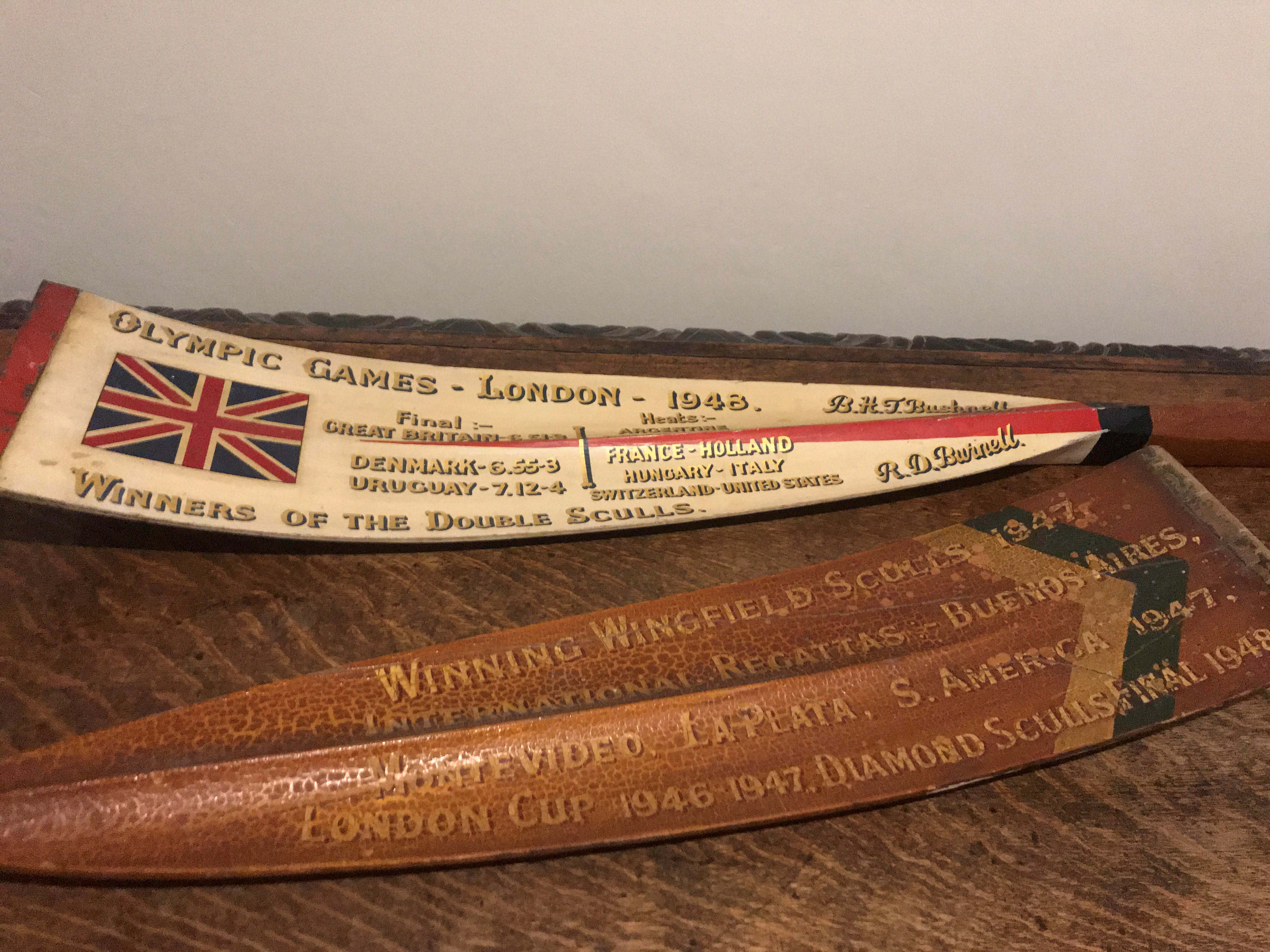 And, of course, there were the two pairs which hung high on the wall at opposite sides of the hall. One pair were the winning blades which had propelled Bert to victory in the 1947 Wingfield Sculls and also seen action in international regattas in Buenos Aires and Montevideo and the final of the Diamond Challenge Sculls in 1948 when he was beaten by his Aussie mate Merv Wood. The other pair were from his gold medal win in the 1948 Olympic double sculls with Richard Burnell.