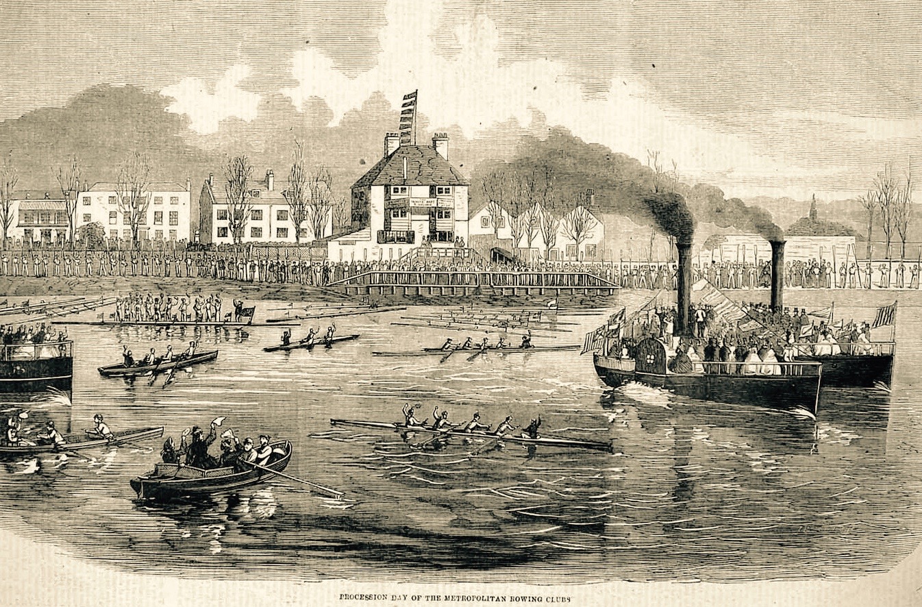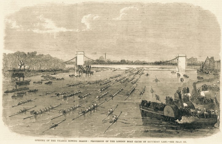 2020 is the year that keeps on taking. I had prepared a little historical piece for posting after 28 August, the date that British Rowing set for the final part of the phased return to rowing in England as Covid-19 rules are relaxed. Singles, pairs and doubles have been afloat since 1 August, two weeks later coxed and coxless fours and quads were allowed out and, starting on the 28th, eights and octuples could take to the water. I planned to compare what I imagined would be a busy scene from Putney to Mortlake on that day with the formal processions that marked the ‘Opening of the Metropolitan Rowing Season’ in times past. As shown below, the start of the 1866 season seems particularly well documented.