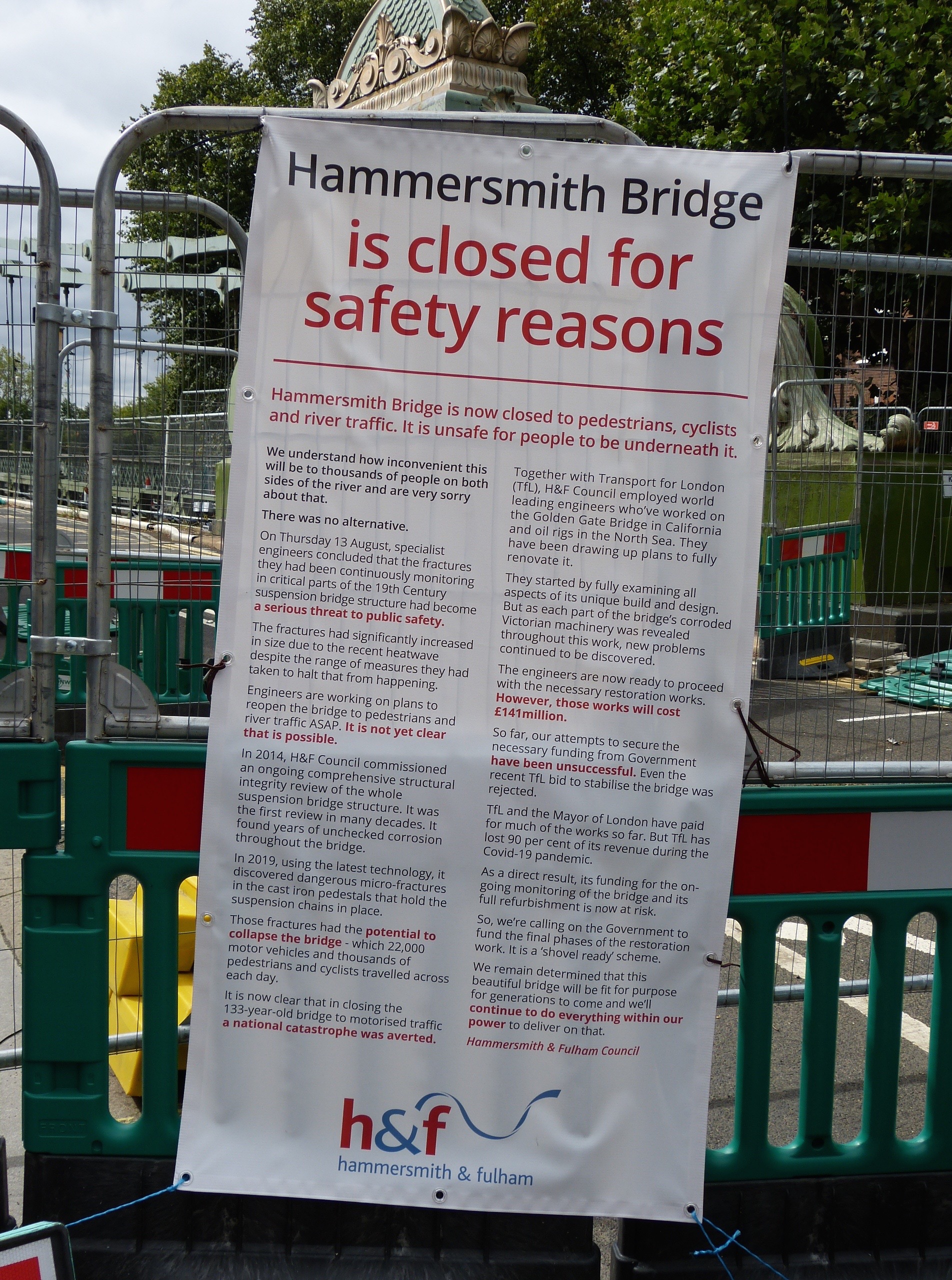 This morning, the Port of London Authority issued a Notice to Mariners closing the River Thames under the whole of Hammersmith Bridge and 15 metres to either side, following the closure of the bridge itself to all traffic including pedestrians and cyclists by Hammersmith and Fulham Council.
