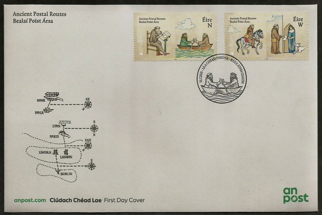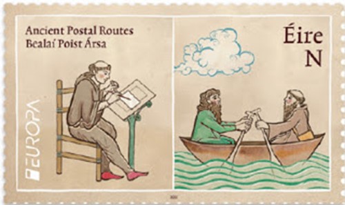 Delayed by the COVID-19 pandemic, the 2020 Europa stamps from An Post were finally issued on 16 July in the form of a two-stamp set with the designs reflecting this year’s theme for the pan-European series of Ancient Postal Routes. The first stamp depicts a clean-shaven medieval Irish monk writing a letter, as well as depicting another monk and a ferryman, both bearded, on their way to deliver the said letter. The second stamp depicts a monk on horseback riding to a convent where he is seen delivering the letter to a nun. Both the stamps and the First Day Cover (FDC) were designed by Red&Grey from illustrations by Orlagh Murphy.