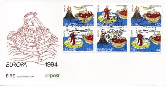 In 1994, Ireland, Iceland and the Faroe Islands issue a similar twinset of stamps for that year’s Europa Issue, the theme being Great Discoveries. The three postal authorities joined together to celebrate the early 6th-century voyage of Saint Brendan to Iceland. Despite not being canonised in his lifetime, Brendan appears on the stamp with a saintly halo. He is the patron saint of boatmen, although Saint Clement I might dispute this. Brendan the Navigator is thought to have travelled as far as present-day Newfoundland and his voyage is celebrated in song by Christy Moore. His transatlantic journey was retraced between May 1976 and June 1977 by a five-man crew from Brandon Creek in Dingle, County Kerry. The resultant film of this historic voyage is available on YouTube – Part 1 and Part 2.