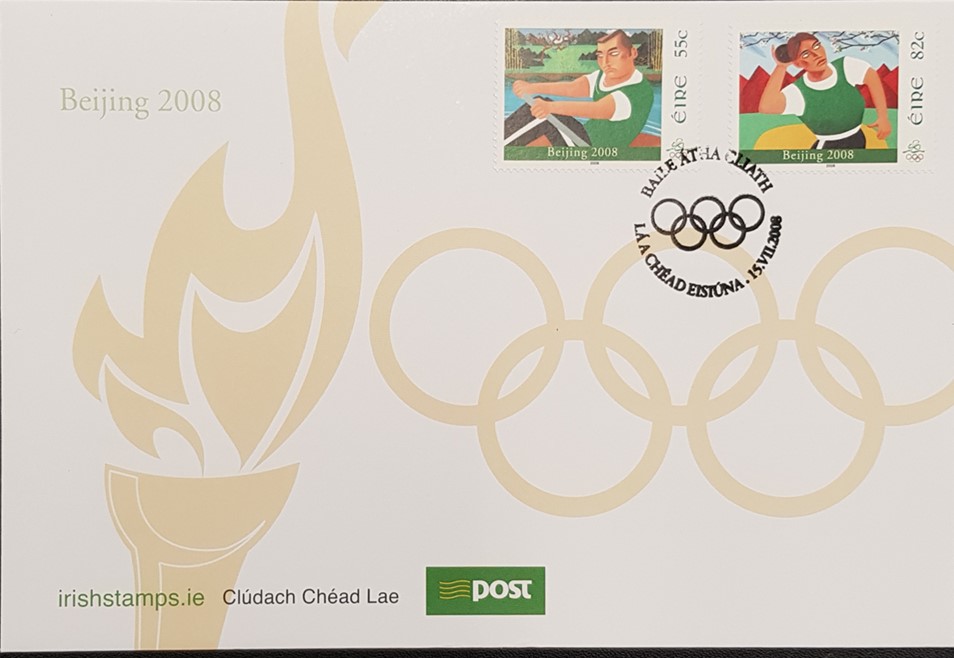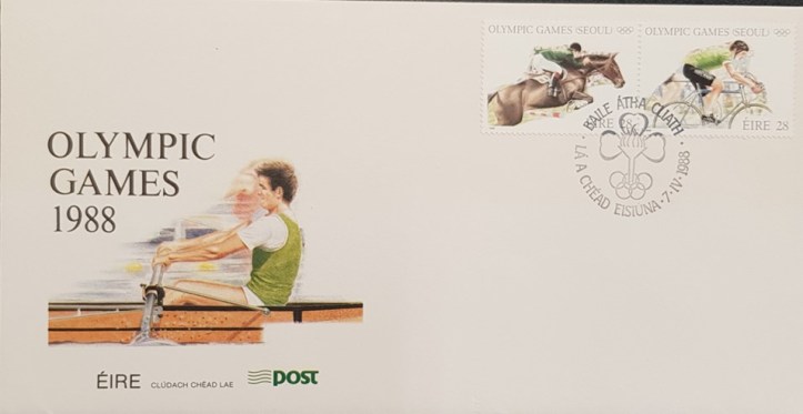 If rowing technique did not top the list of requirements in Knuttel’s commission from An Post, the same cannot be said of Ann Flynn’s design for the 1988 Olympic Games FDC. I have long admired the rowing image and wished it had made it on to a stamp. Looking at it with fresh eyes, I now notice that the three sports depicted are all ‘seated’ sports and perhaps the composition of the two se-tenant stamps, also designed by Flynn, with the competitors facing forward, was all part of her master plan. The cancellation stamp made up of a trio of images: Olympic Rings, Olympic Torch, and a Shamrock, add greatly to the cover.