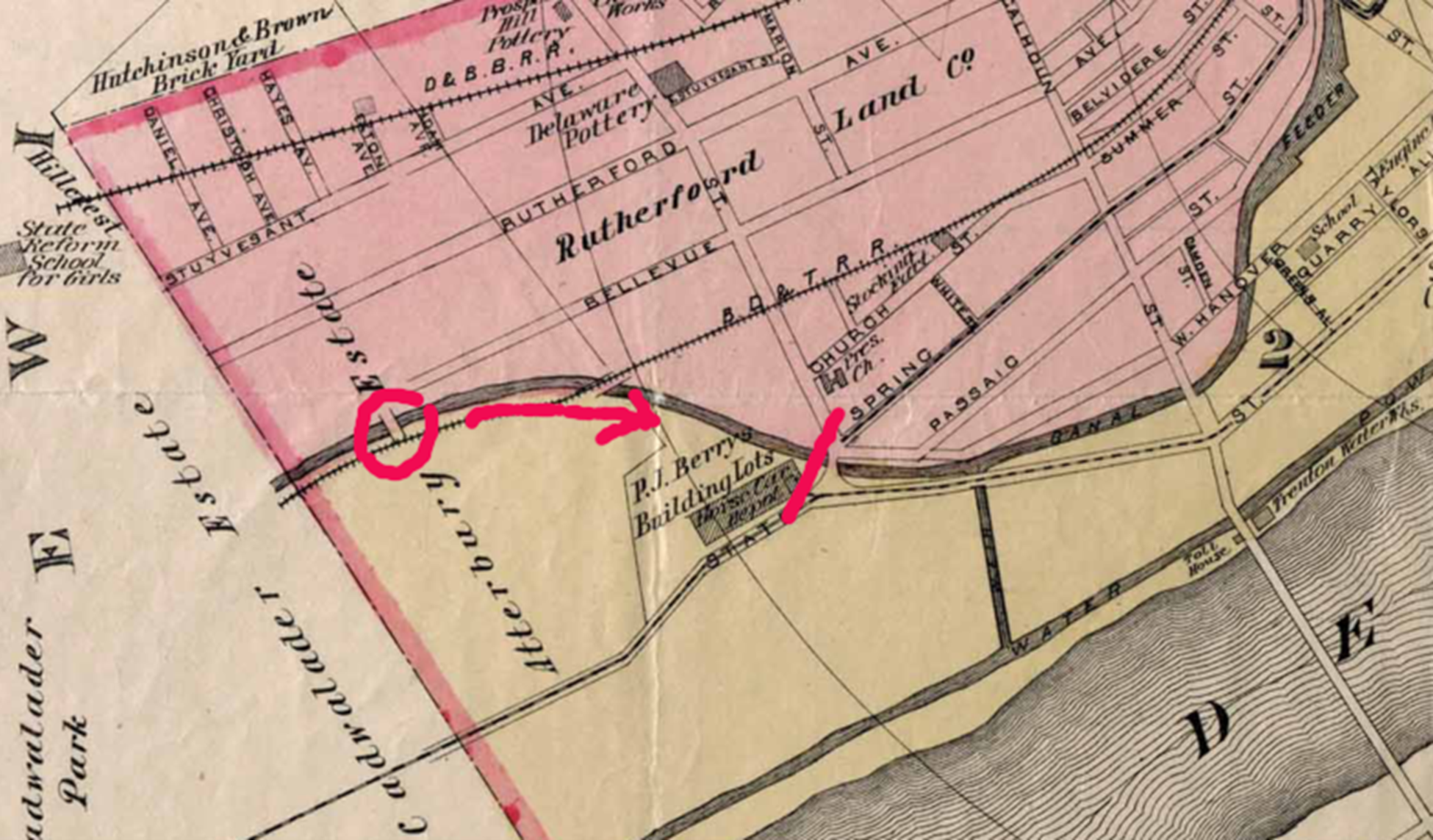 Thanks to Kathleen McGuire at the Trenton Historical Society, I can embellish this story with an 1884 map of Trenton featuring the Atterbury estate with the indicated small bridge, also the start, no longer extant. Using scale, I have marked the probable course on the canal.
