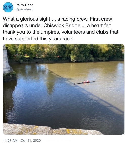 In times not blighted by war or pandemic or bridge closures, the Mortlake – Putney ‘Championship Course’ on the River Thames (most famously used – in the other direction – by the Oxford and Cambridge Boat Race) will host major head races for all classes of boat throughout the year. For eights, March usually sees the Head of the River Race, the Veterans’ Head, the Women’s Head and the multi boat class Schools’ Head. Naturally, these were lost to the start of lockdown but in the latter part of the year there is normally the Pairs Head in October, the Fours Head and the Veteran Fours Head in November and the (single) Scullers Head in December. Presently, there is no news online about the race for singles but the time trial for pairs and doubles took place recently and both Fours Heads are – currently – ‘on’. Further, another ‘Championship Course’ race, the Wingfield Sculls, should also be going ahead at the end of this month.