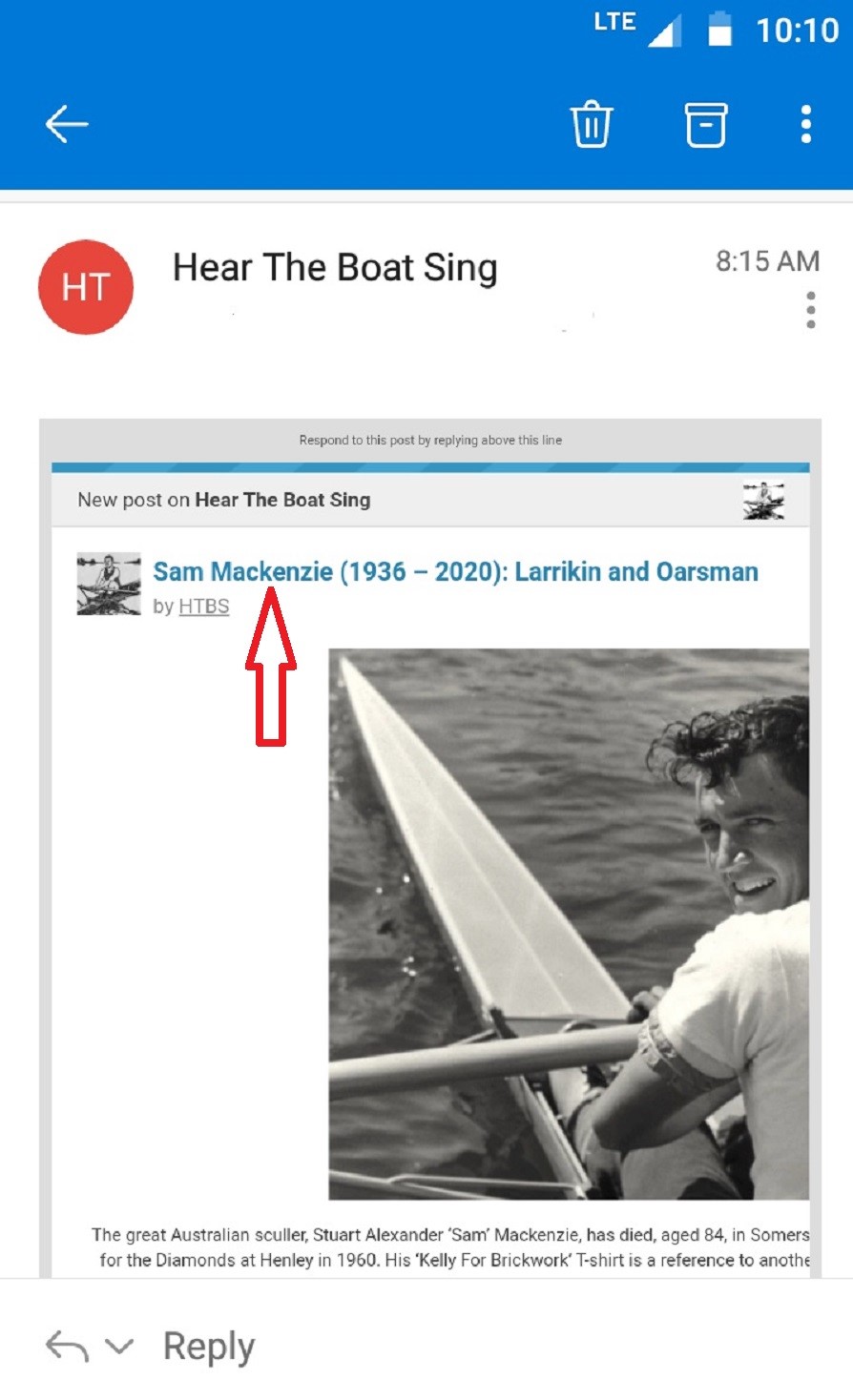 I’m afraid, there is no way I can send the HTBS articles differently to your e-mail addresses that would solve this problem. However, this being said, there is an easy way to read the HTBS articles on your mobile phone without them being ‘cut’. While you are looking at the e-mail version of the article, please click on the blue coloured headline (see red arrow in the screen shot on top). This will take you to the HTBS website where you can read the article without any technical problems.