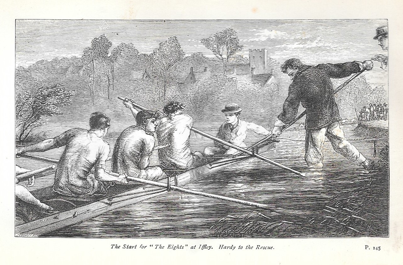 A four-oar row down the river had been arranged for me. Jupp and Darbyshire, the nephew of the celebrated late University stroke oar of that name, went with us. We left our boat under one of the long bridges and walked to the start of the first division. The boats were kept in position by long poles held by water-men from the shore and also by a cord held by the cockswain [alternative spelling of coxswain]. The Oriel crew had been bumped every night for several nights running, and the men were thoroughly demoralized. They tried to appear calm, but they were evidently very nervous. They lose their heads as soon as they start and have not once got through the “Gut” before being bumped, so that Hall, their cockswain, the famous one who steered the Oxford four against Harvard in ’69 and almost won the race for Oxford in ’70 by sheer good steering, had no chance to show his powers. […]