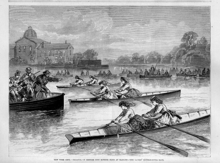 Rowing historian and HTBS writer Tom Weil shows some women rowing in an early image on rowing historian Bill Miller’s eminent website “Friends of Rowing History” (www.rowinghistory.net). The image is from an autumn 1871 regatta of Harlem’s Empire City Rowing Club, which included a women’s double sculls race. The image was published on 14 October 1871 in Frank Leslie’s Illustrated News.