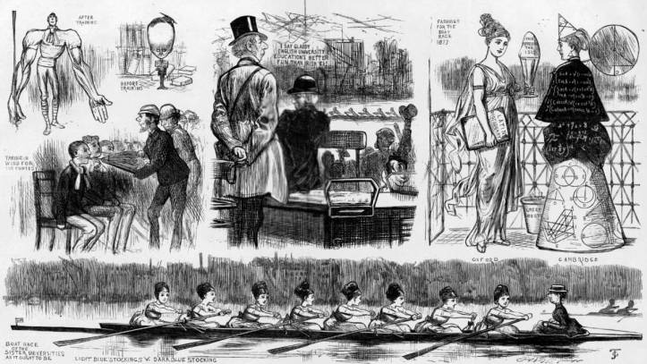 The top left compares an oarsman with grotesquely enlarged arms “after training” to a tiny man with a huge egg-shaped head who represents “before training”. In the middle, one spectator of the Boat Race says to another “I say gladdy [?] English university education’s better fun than Irish, eh? On the right, “Fashion for the Boat Race 1873”, [T]he two women in the corner represent Oxford and Cambridge: the first, who holds a Latin dictionary, embodies Oxford classical learning and appropriately wears Greek or Roman dress, and the second wears clothing covered with mathematical formula, indicating Cambridge’s reputation as a leading scientific university. On the middle left, some oarsmen are “Taking in wind for the contest, while [t]he bottom panel, which is entitled “Boat race of the sister universities as it ought to be,” depicts a woman’s crew [sic! Actually, two crews as there is a second crew coming in from the right, slightly faded in the image] rowing a shell – “light blue stockings v. dark blue stockings.” – a joke in 1873 but reality today. Satire as prophesy?