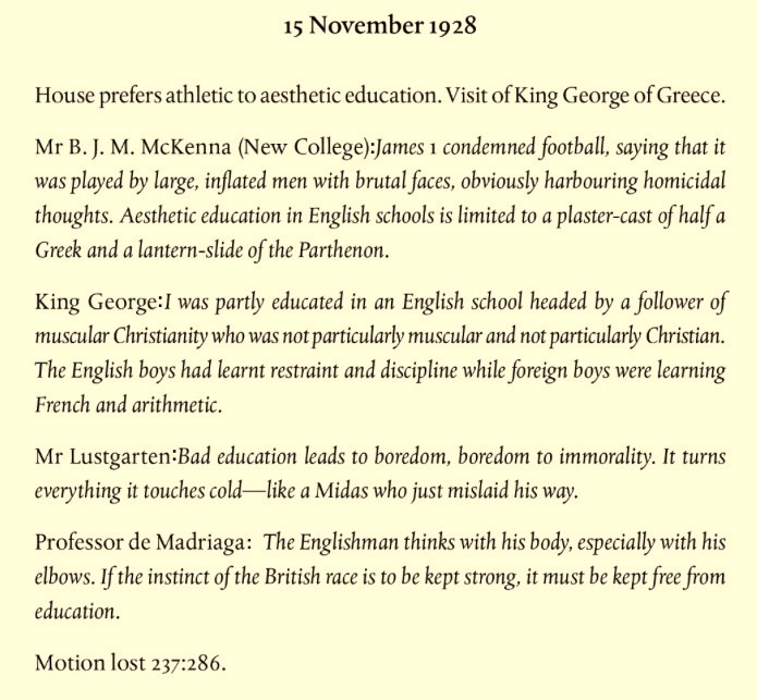 In 1928, the Oxford University students’ debating society, the Oxford Union Society, considered the motion, ‘This House prefers athletic to aesthetic education’. The suggestion seemed to be that the two were mutually exclusive and that the choice was between ‘brawn or brains’ and that one had to be either an ‘aesthete’ (one who understands and enjoys beauty) or an ‘athlete’.