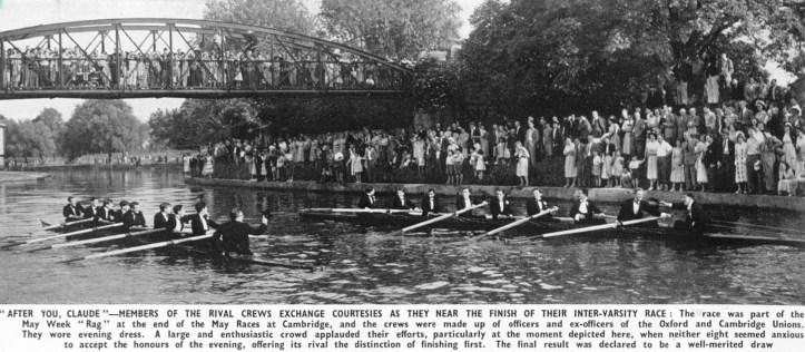In the modern age, great deference is paid to those who somehow gain the status of ‘celebrity’. In the recent past, things were just as bad but it was the antics of people such as the young gentlemen at Oxford and Cambridge that enthralled the masses and it was these fellows that the public want to see rowing, both properly – in the University Boat Race – and badly – as reported by the Sphere of 24 June 1950. The magazine covered a boat race between officers of the debating societies of both universities, the Oxford Union (founded 1823) and the Cambridge Union (founded 1815).