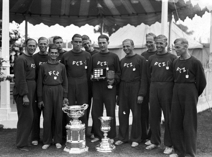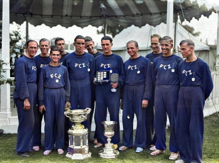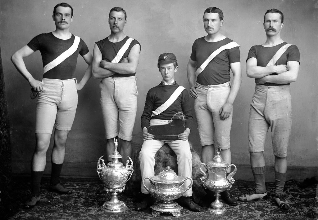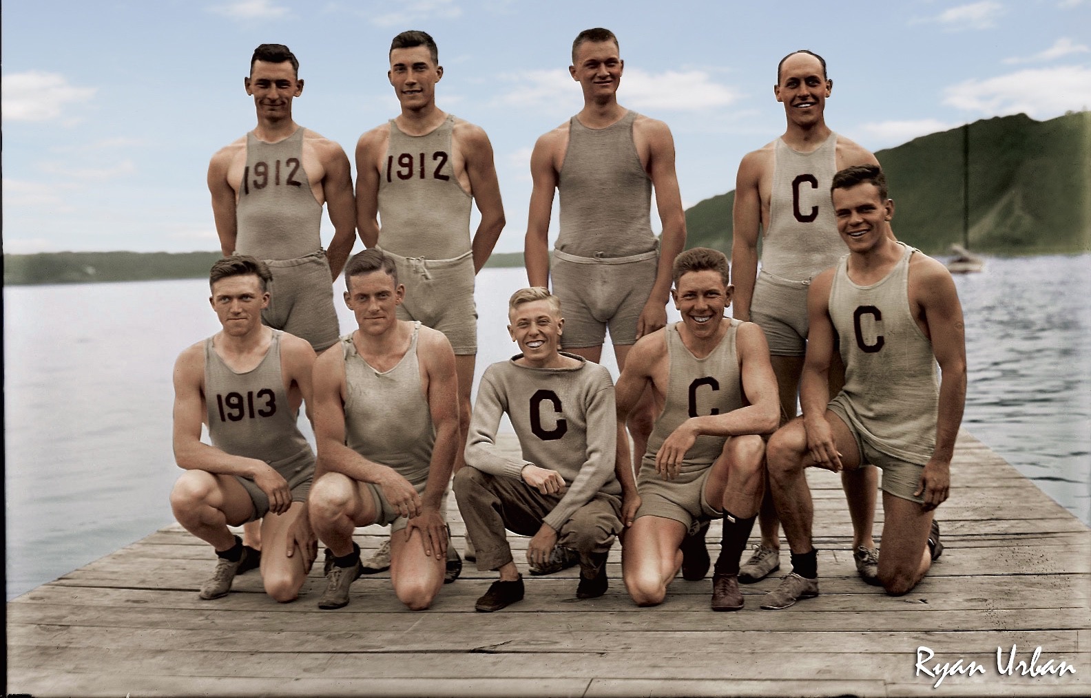 Finally, below is a picture that I think begs to be colourised. It is a high-resolution shot of the Leander crew that won the Olympic Eights in Stockholm in 1912. If anyone can do this, remember that the caps, scarves, socks, tie, hat band and piping on the dirty white vests are cerise in colour. The cox sitting in the front, Ben Wells, is wearing his Oxford blazer, dark blue with a dark blue trim. Ewart Horsfall (third from the right) seems to be wearing socks of a darker colour than the others – they could be his dark blue Oxford hosiery. Leslie Wormald (third from left) does not seem to be wearing a Leander cap. He rowed for Eton, OUBC and Magdalen College. Most likely it is an Eton cap, though not the famous light blue of the First Eight, Wormald was only in the second boat. A chance to rewrite history perhaps?