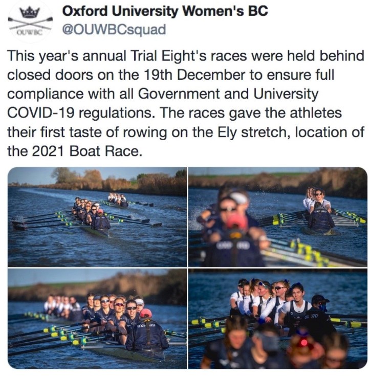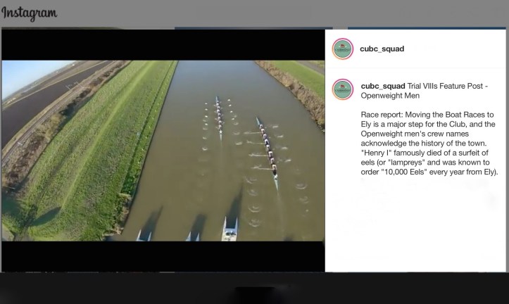After I wrote my piece on the recent Boat Race Trials, the Oxbridge boat clubs posted coverage of the races on social media (typical students, handing their work in late). Oxford posted on Twitter, @OxfordUniBC and @OUWBCsquad. Cambridge, now one club for men and for women, posted on Instagram, @cubc_squad.