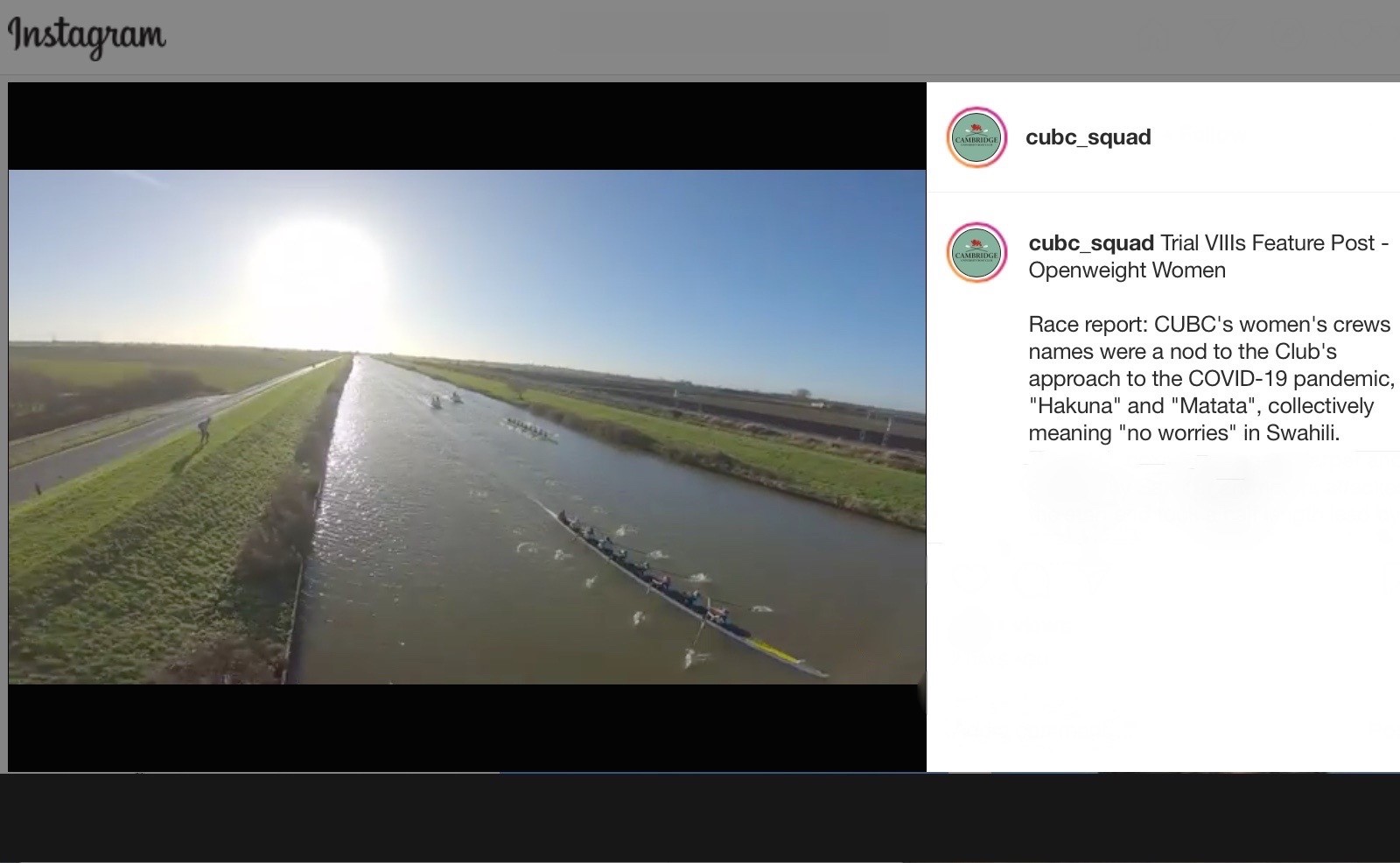 After I wrote my piece on the recent Boat Race Trials, the Oxbridge boat clubs posted coverage of the races on social media (typical students, handing their work in late). Oxford posted on Twitter, @OxfordUniBC and @OUWBCsquad. Cambridge, now one club for men and for women, posted on Instagram, @cubc_squad.