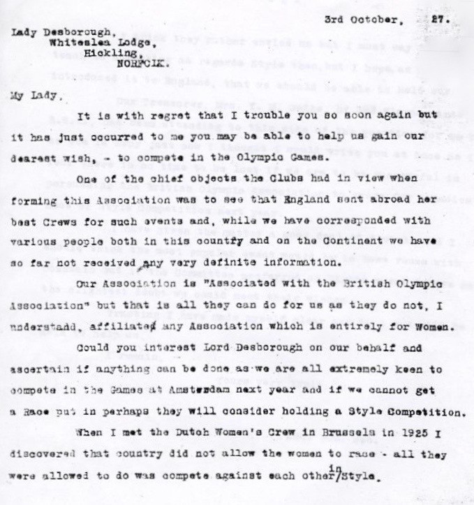 Amy Gentry OBE (1903 – 1976) was active in women’s rowing for more than 50 years, first as a competitor and then as an administrator. She would have spent more time with her typewriter than she did with her oars as she earned her living as a secretary and also ran the Women’s Amateur Rowing Association and the Weybridge Ladies Rowing Club. In her lifelong efforts to improve and promote women’s rowing, she must have typed many hundreds of letters and missives to further the cause.