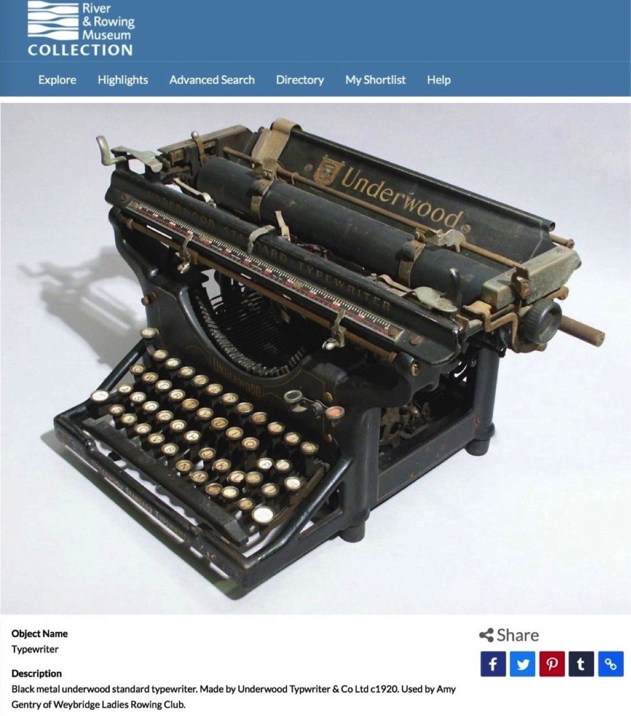 I am seeking the Impeachment of the HTBS Editor-in-Chief, Göran R Buckhorn, for failing to find any strong rowing connections in his recent article on typewriters. As the above shot taken from the online catalogue of items held by the River and Rowing Museum shows, there is at least one not-too-tenuous link between the two.
