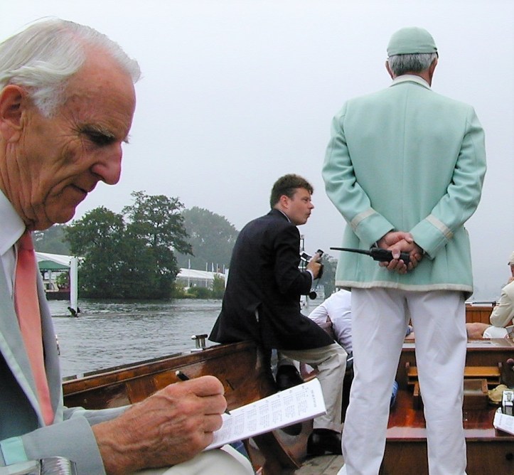 For all the formality, the umpires’ launches were not without their humorous moments. During a filming visit to the regatta by Ruby Wax in the early 1990s, she was invited to watch a race from the chairman’s launch, where she was greeted by Bill and Adrian. Within minutes she had managed to persuade Bill to swap his Cambridge cap for her own scarlet feather fascinator, an occasion which is sadly not recorded on camera!