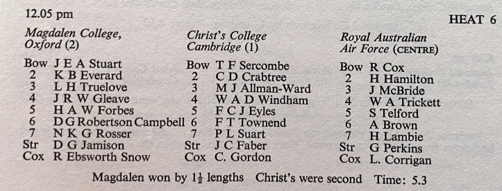 Though I never knew Bill Windham we have several second level connections. In the 1945 Danesfield Cup the man who rowed in the corresponding 4 seat for Magdalen College against Bill’s Christ’s College crew was John Gleave who coached my Pembroke Cambridge crews several times in the 1970s. John and Bill both rowed in the 5 seat, John for Oxford and Bill for Cambridge, in the 1947 Boat Race. Other men with Bill in the 1951 Cambridge crew were James Crowden, an alumnus of Pembroke and long time coach of Pembroke and Cambridge crews, as well as Charlie Lloyd who had gone to the same high school as me in Sydney. In the 1952 Olympics the Australian VIII that pipped Great Britain for the bronze medal included Phil Cayzer, a family friend in Sydney and for many years a coach at Sydney Rowing Club. The rowing world is smaller than you expect.