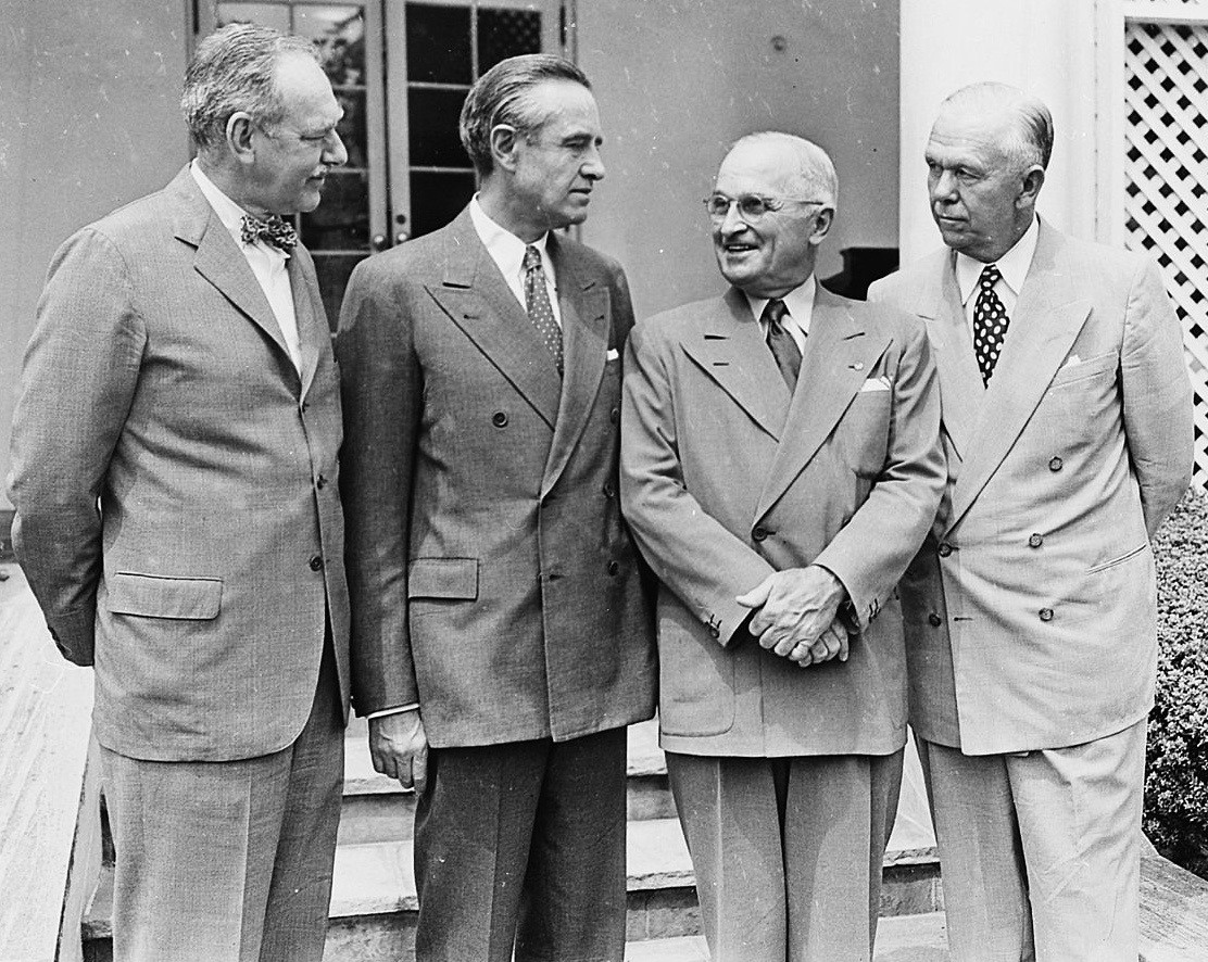 After the War, Harriman was briefly Ambassador to Britain but was soon appointed President Truman’s Secretary of Commerce. He was concerned that, with the arrival of peace, most Americans only wanted ‘to drink Coke and go to the movies’. He felt that the United States should take an interventionist role in ‘defending freedom’ around the world. Motivated by ‘noblesse oblige’, Harriman and other patricians paid little heed to the instinctively isolationist American public opinion. He and fellow Yale Crew alumnus, Dean Acheson, were the leading members of the group of six friends who later became known as ‘The Wise Men’.