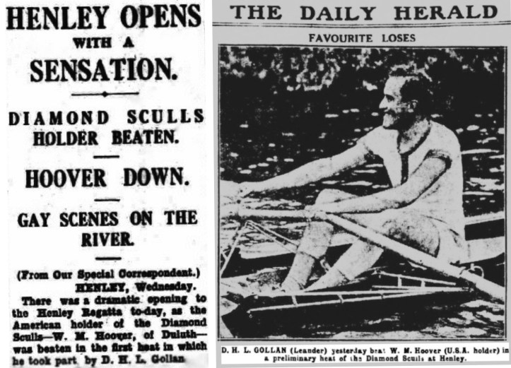 (Hoover) started unevenly… and fouled a boom. This happened at a stage when Gollan is usually not too sure of himself and therefore when he found himself leading he seemed to be inspired, rowing the rest of the distance finely, to win a rousing ovation.