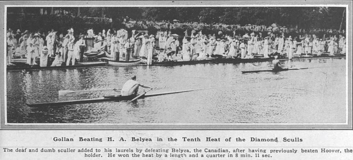 1923: In the semi-final, Gollan continued to impress by beating the Canadian HA Belyea, who had won the Canadian Henley Singles Scull Championship in 1921 and 1922. It was a shock when Golan lost the final to the inexperienced and unknown London RC sculler, Morris K. Morris.