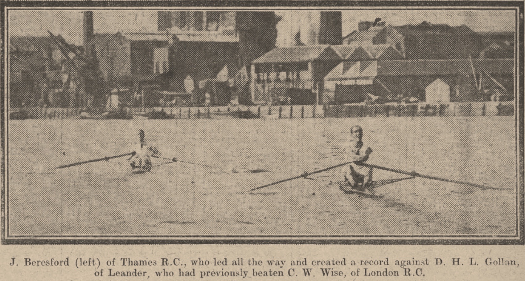 The London Cup of 1923 was the only time that Gollan ever officially beat Beresford. It was a rather hollow victory however, as Beresford was disqualified for fouling. The Times wrote, ‘If Beresford had steered a better course he probably would have won, for he had just taken the lead’.