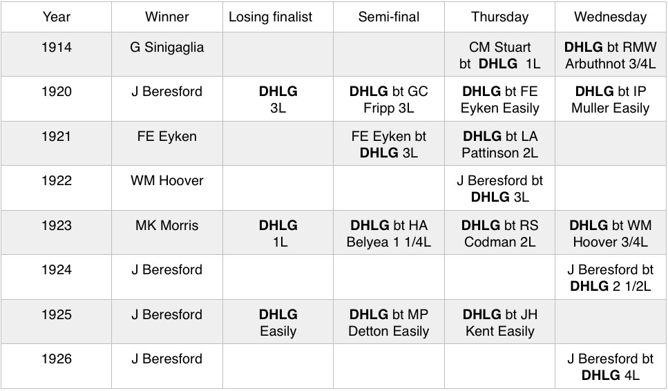 Certainly, by the end of the 1926 season, Gollan was 30 and must have realised that he was unlikely to ever satisfactorily beat Beresford – who showed no signs of slowing down or retiring. Perhaps his last race in a single was at the Vesta Dashes on 2 June 1927 when he was beaten in the preliminary round by the 21-year-old Hugh ‘Jumbo’ Edwards (who, in turn, lost to Beresford in the final).