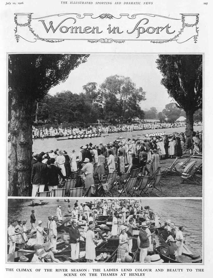 The “Illustrated Sporting and Dramatic News” of 10 July 1926 gave a whole page to ‘Women in Sport’. However, the sporting achievement that it chooses to highlight was that ‘ladies lend colour and beauty to the scene on the Thames at Henley’.