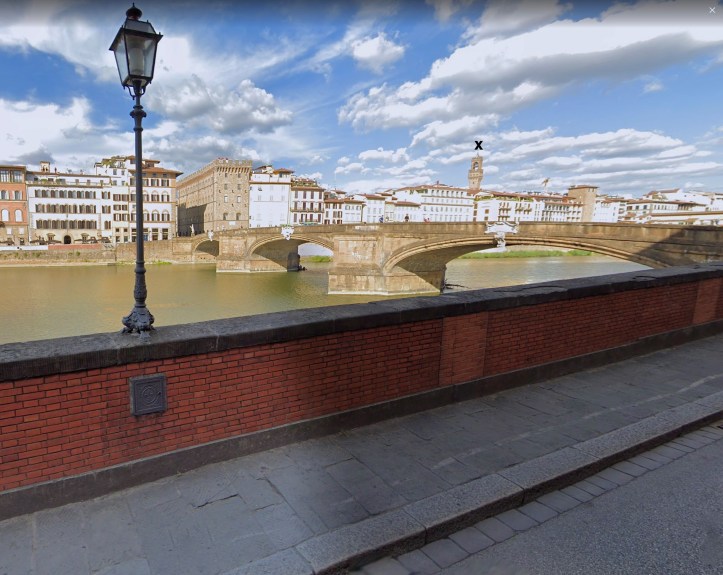 A Google Earth view of the same spot today – the Tower of Arnolfo, part of the Palazzo Vecchio, marked with an ‘x’ here, confirms this. The bridge was completed in 1569 but was destroyed in the Second World War. It was reconstructed using stones from the original bridge and from the original quarry.