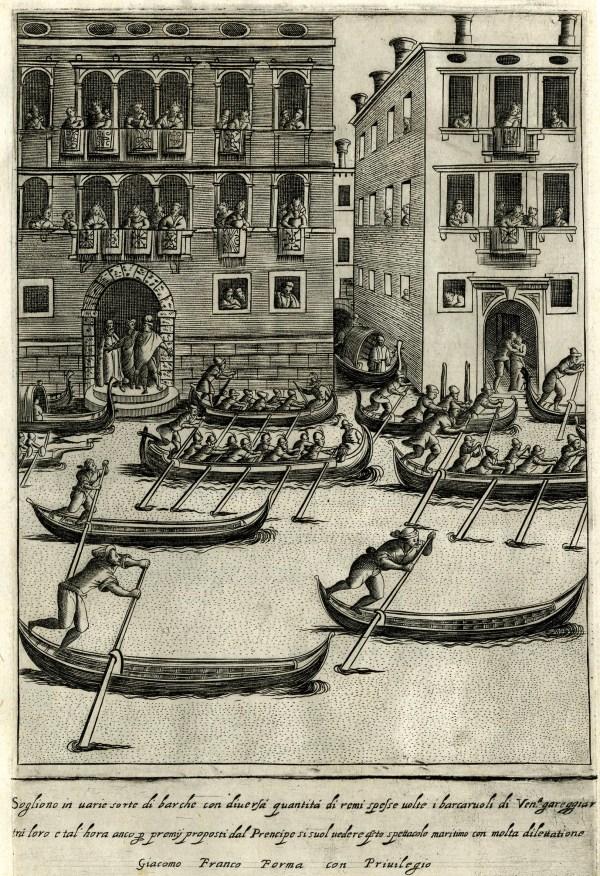 Racing of gondolas and rowing boats in Venice by Giacomo Franco, 1610. The inscription notes that races are ‘in various sorts of boats with different amounts of oars’ and that ‘it is usual to view this maritime spectacle with much delight’. A similar women’s race was drawn by Franco at the same time. © The Trustees of the British Museum.