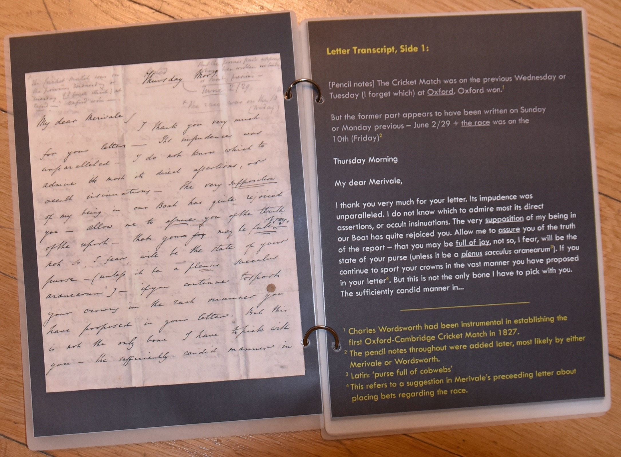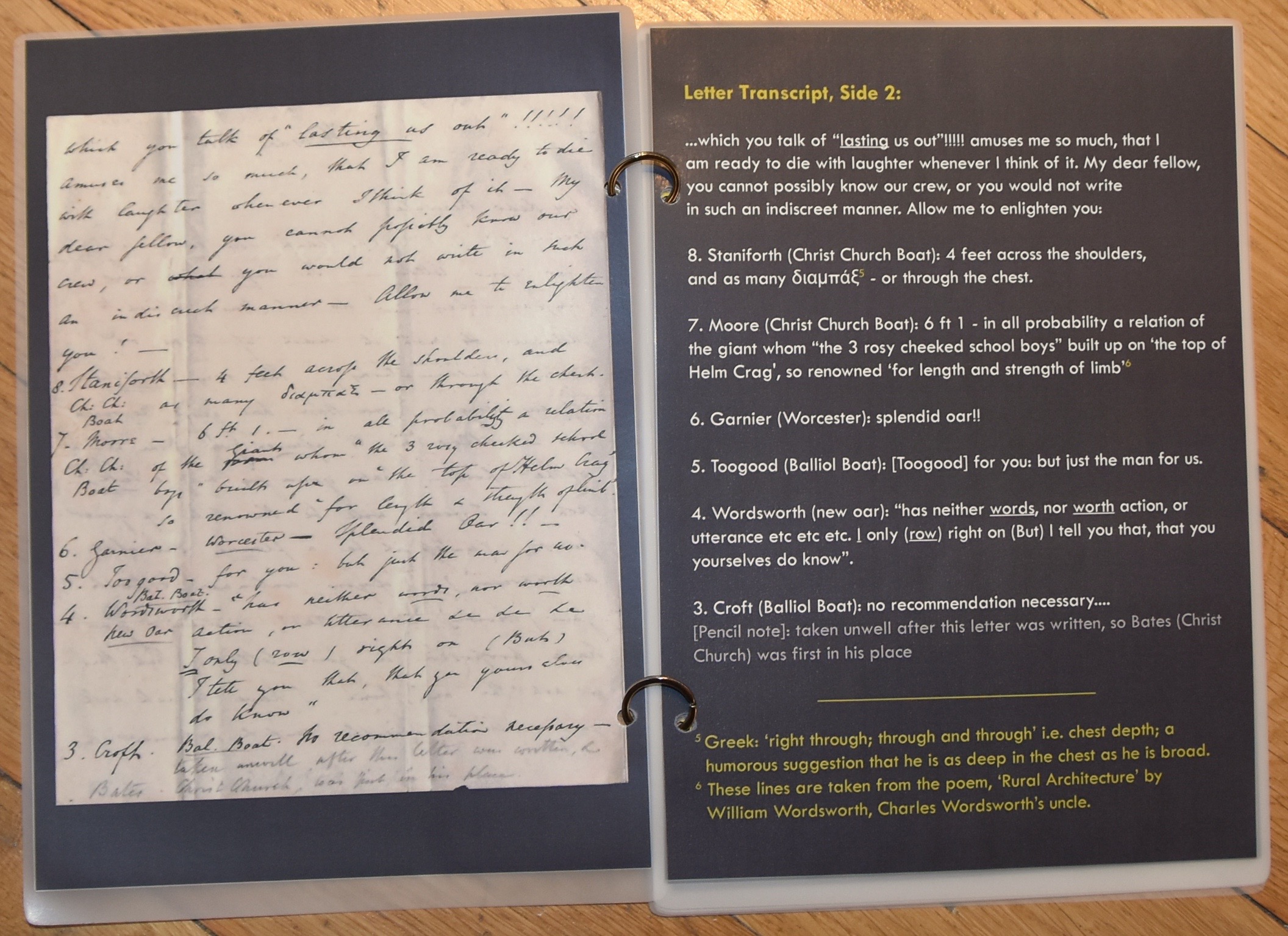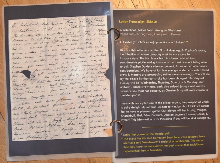 Prior to that first Boat Race, Wordsworth and Merivale wrote to each other about the upcoming match in Henley. An amusing letter of 2 June 1829 to Merivale from Wordsworth (a reply to a letter that unfortunately is now lost) was purchased by Henley’s River and Rowing Museum in 2019. Göran R Buckhorn thinks that it may be ‘One of the most important letters in the history of rowing’. Next to the museum display case containing the precious piece of correspondence is a booklet with a facsimile of each page of the letter with a printed explanation opposite.