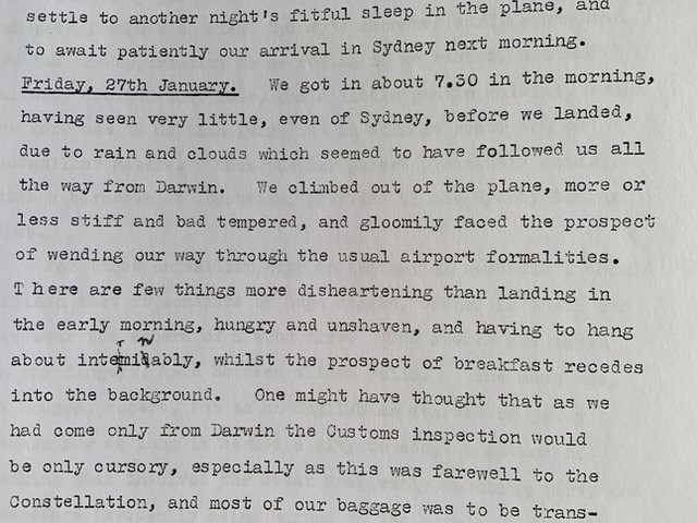 One of the minor drawbacks to flying West is the time factor already mentioned. Arrived at what seemed to be the end of a long day, and wanting nothing so much as a bath and an evening meal, we were met by people who seemed to think it was only just tea time. And the upsetting thing, of course, was that they were absolutely right. But the Australian Customs at Rose Bay had evidently been told to be kind to us, and this time they raised no difficulties over our assorted contraband. What did not please us so much was to be told that we were scheduled to take part in a march through the city next morning. This time I fear we were not so amenable. Personally I was willing to take the part of the captive in golden chains at what was obviously to be a Roman Triumph; or I was prepared to be sacrificed on the alter of rowing fellowship on the Parramatta. But parade in the morning, and then row afterwards I would not. A compromise was reached in the end, by which some of us were to attend the reception, but not the march. Unfortunately by the time this was settled half our party had been whisked off in buses to their various hotel, and nobody really knew what the plans for the next day were.