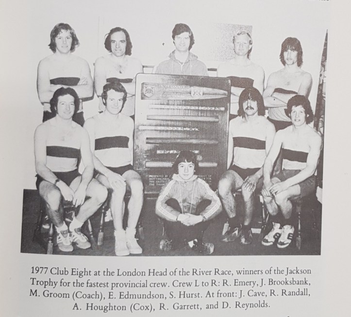 City Orient’s major successes began the year before when they were victorious at 1977 Henley Royal Regatta, winning the Wyfold Challenge Cup for club standard coxless fours. Winning crew: D. G. Soan (Bow), J. J. Watling (2), A. M White (3) and D. J Carruthers (Stroke). They could easily have picked up the Jackson Trophy earlier that season, but as a new entry themselves, they started 292nd. St Neots Rowing Club who started 93rd, piped them to the post by two seconds. The following year, both City Orient and St Neots started in the top twenty at HORR and at the finish, City Orient had just over half-a-minute on their rivals to claim the unusual prize that was The Jackson Trophy – it has since been replaced by another trophy, a Victorian rose bowl.