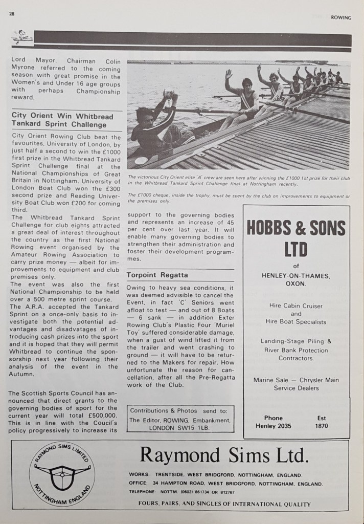 Also, in 1978, City Orient entered a pair in the Silver Goblets & Nickalls’ Challenge Cup. G. M. A. Profitt and E. M. R. Wells, winning a couple of rounds before withdrawing owing to sickness.