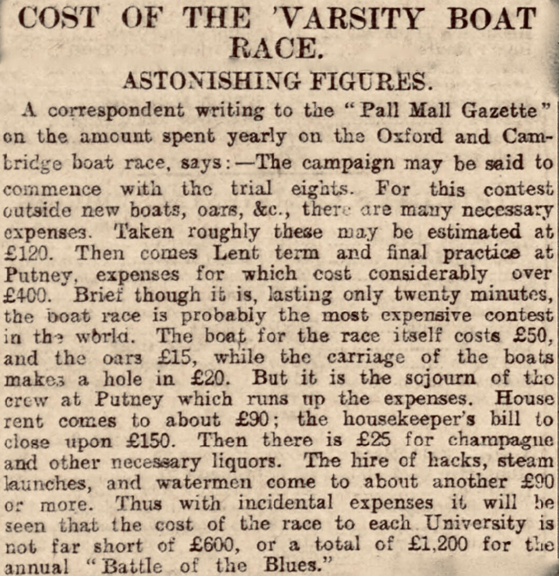 Thus, there are many boring but necessary costs incurred in putting on a modern Boat Race. In the past, such things appear to have been cheaper and easier.