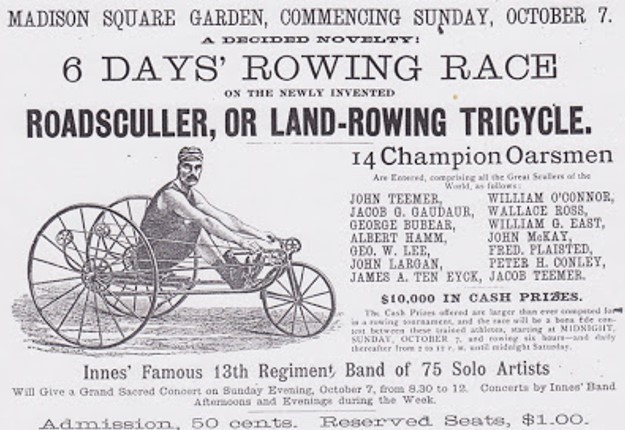 BL: Hanlan and others staged a national tour to amuse their fans by just demonstrating their rowing skills – and charging admission to watch. In theatres, George Hosmer and Hanlan rowed singles on a flooded stage in a melodrama set at the Henley Regatta. In a skating rink, Courtney “raced” Wallace Ross using oar handles to propel wooden boxes on wheels. At Madison Square Garden, 14 famed rowers copied popular six-day bicycle races by riding three-wheeled “roadscullers” around a track for six days. And professional scullers Fred Plaisted and James Ten Eyck brought rowing to vaudeville shows: on stages in the USA and Europe the two operated mechanical appliances that moved miniature sculls to simulate a race.