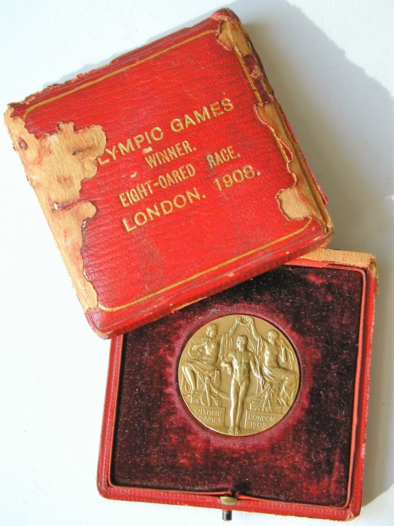 While I was leafing through this treasure trove, picking out some images, he called out from the next room ‘Here’s something which might interest you!’ He had opened a large, velvet-lined box, which contained many valuables, and he handed me the central item – it was Raymond’s 1908 Olympic gold medal.
