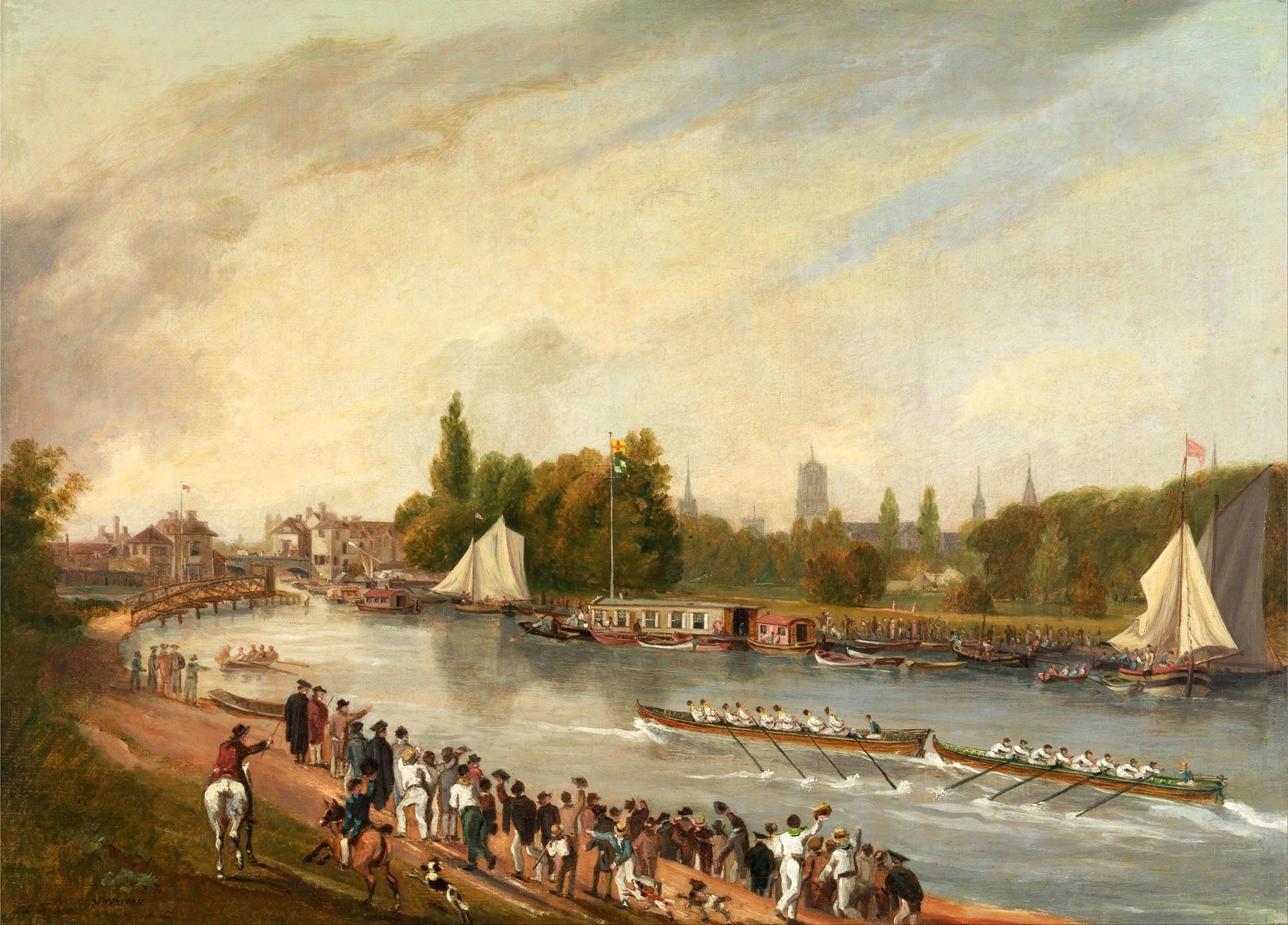 According to Tom, the 1822 aquatint “A Boat Race on the River Isis, Oxford”, showing a bumping race just seven years after the first such recorded contest, is “the first important rowing print.” The printmaker was John Whessell (1760-1828) following a design by John Thomas Serres (1759-1825). Per Weil, “Serres managed to capture the spectrum of elements that would characterise boat race prints for years to come: the boats and their oarsmen, the moment of truth on the river, and spectators and passersby in an idyllic setting.”
