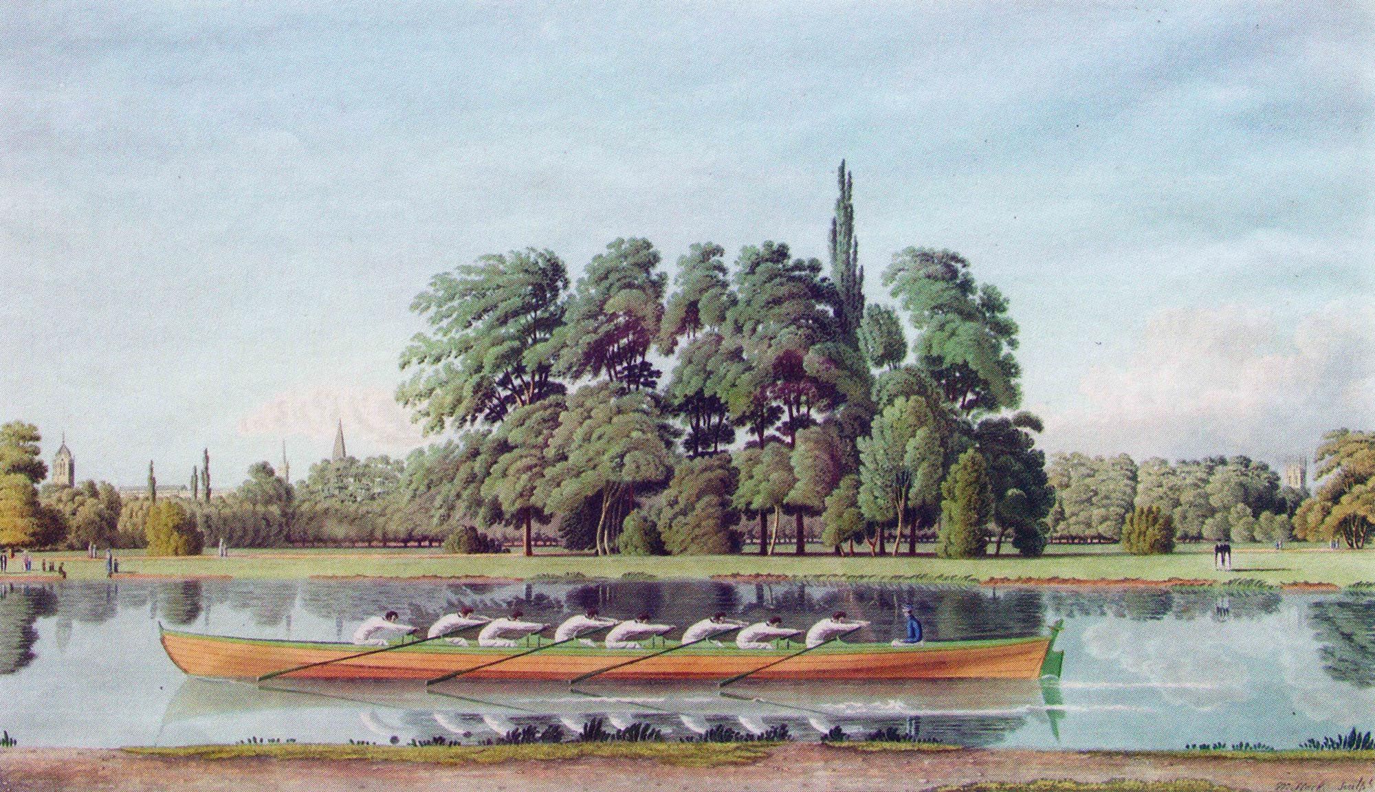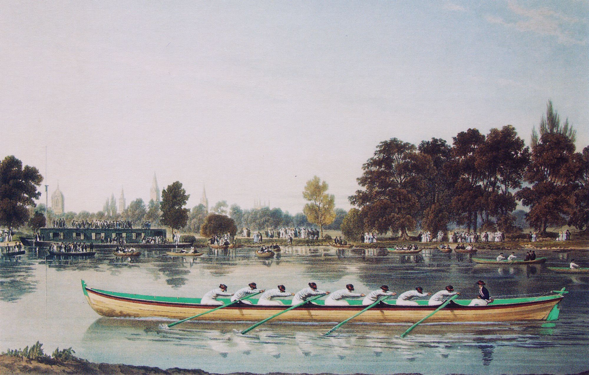 Tom has examined and collected examples – both prints and watercolors – of a number of quite similar versions of Oxford college boats on the Isis during this early period, which he has dubbed the “Isis Navy series”. (Many of these varieties are illustrated opposite pages 11, 36, 39, 56, 85 and 97 of Rev. W.E. Sherwood’s Oxford Rowing (Oxford and London: Henry Frowde, 1900), which currently constitutes the most comprehensive compilation of such images.) Information about these prints, including the exact subject(s), the artist(s), the publisher(s) and the date(s) and location(s) of publication is almost completely lacking, and, when provided, is often contradictory. For example, copies of the aquatint above were apparently marketed throughout the years variously as depicting, inter alia, Exeter College, Merton College, and (per Sherwood) “Crew with Tam O’Shanters”. All of the variants display the Oxford skyline in the far distance; differentiating characteristics noted by Tom include the depth of and vegetation on the near bank, the depiction of bushes and trees and the placement of spectators on the far bank, and the location of boat club barges, with or without flags, and the presence or absence of other river craft (but never a racing boat in close proximity to the main subject).