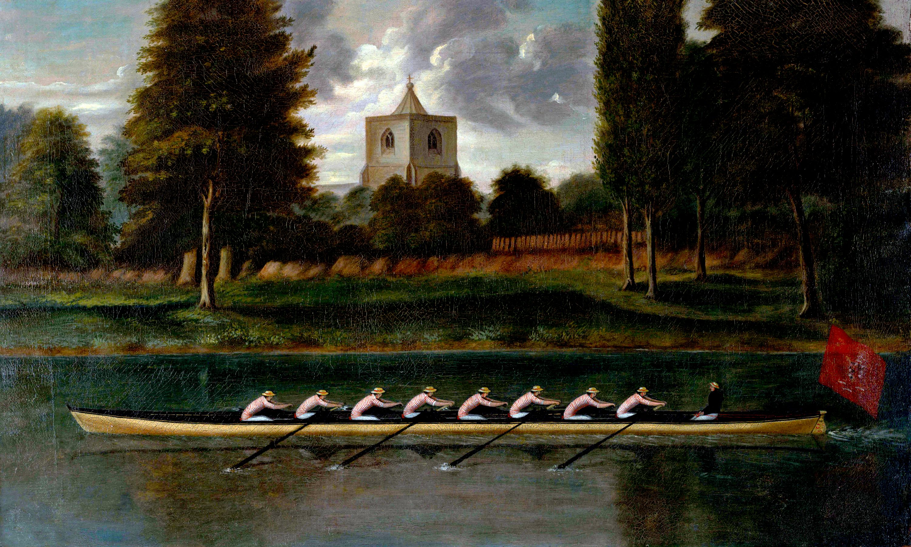 Dear Peter, I am afraid I must point out that the paintings do not accurately depict a crew rowing in the Lents as suggested above – at that time of year, the trees beside the river Cam are not in leaf. Henrietta Butler