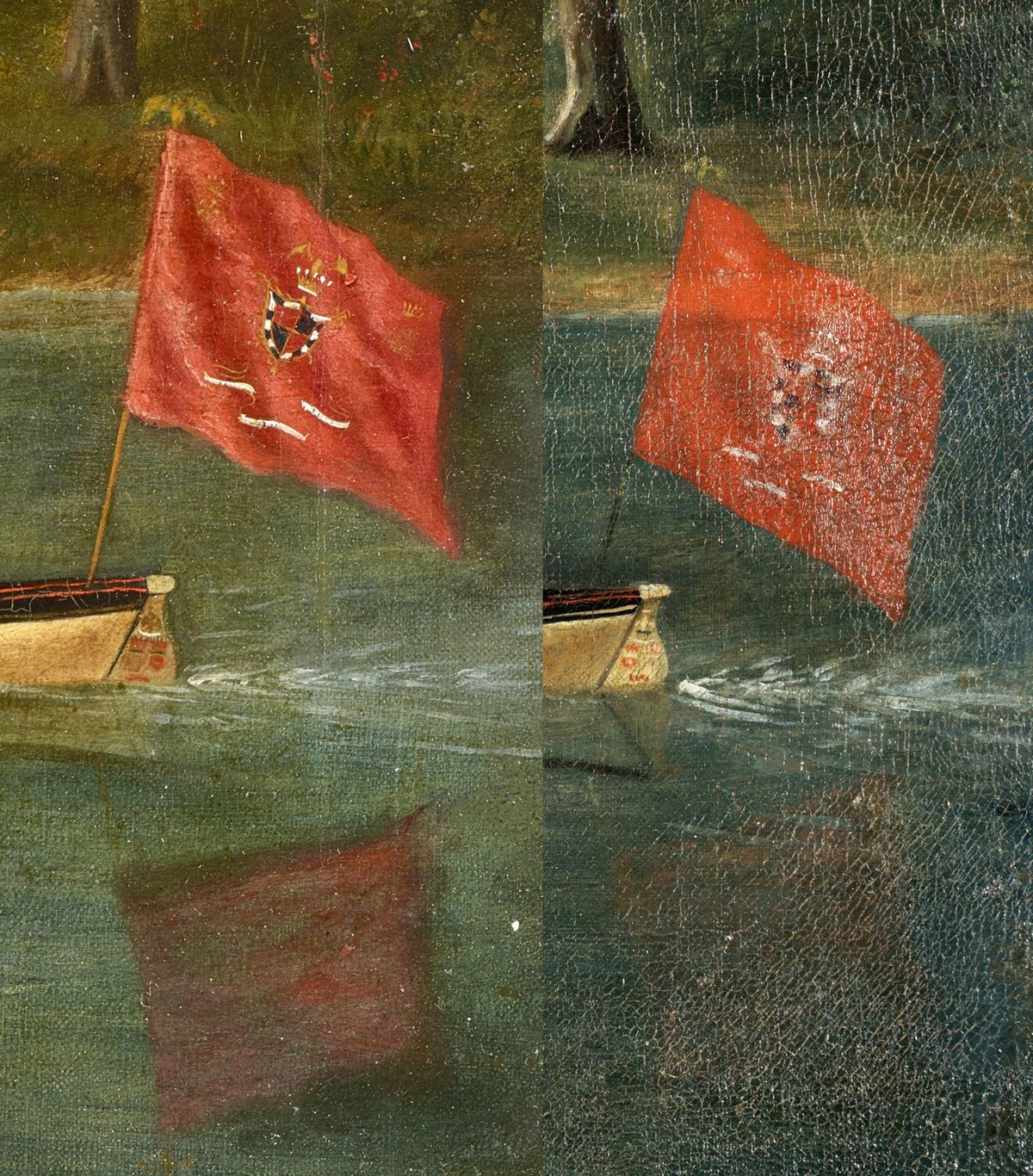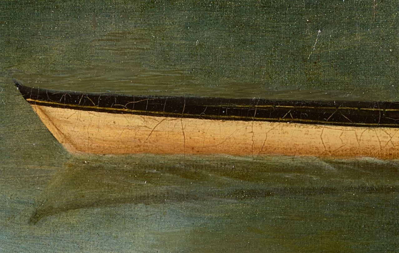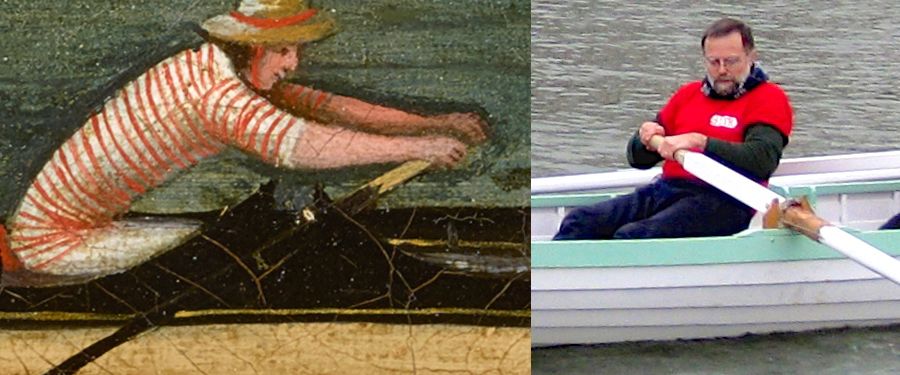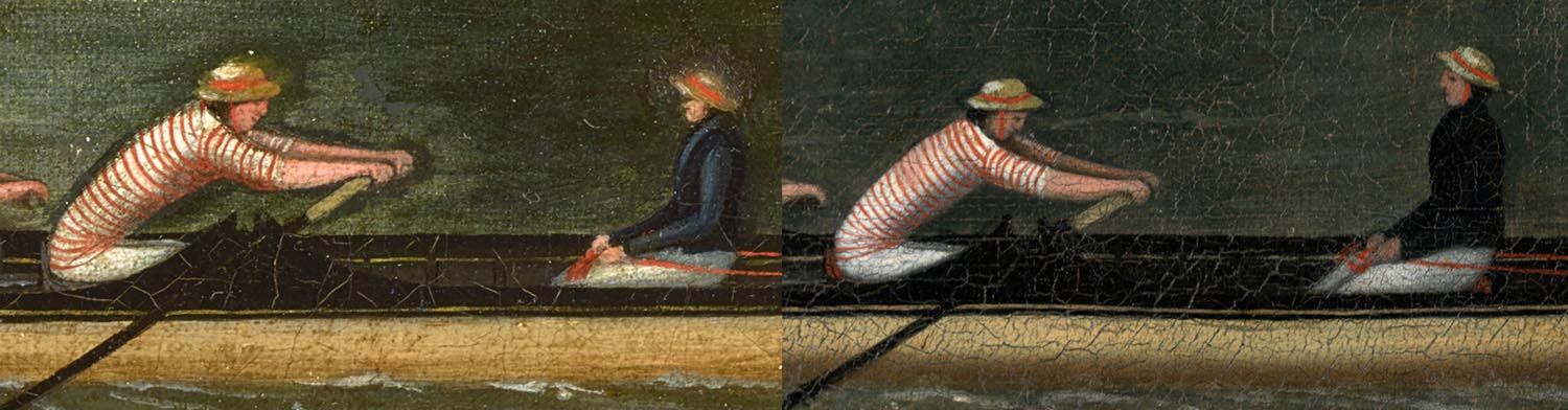 It is also obvious that there was more than one hand at work. There is no question that a single person with excellent skills painted the horizontal stripes on the rowers’ shirts in both paintings, but two different people with different skill levels, perhaps a master and his apprentice, painted the bulk of the two paintings, the master responsible for the Mallory version and the apprentice painting the Lighton version.