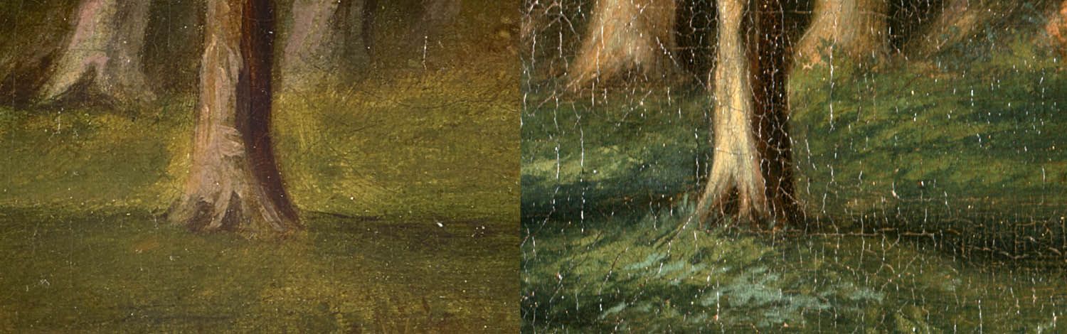 It took many months, but the painting was reborn beyond anyone’s dreams, and now that I have hi-res scans of both pictures, I can confirm that they are two peas in a pod. One overlays the other perfectly, but that does not mean they are absolutely identical. Having two examples of the artist’s work product allows us to delve deeper into his work methods.