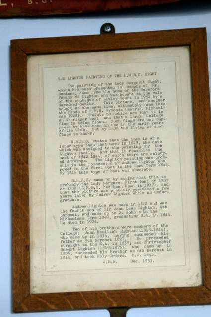 R.H.H.S. sums up by saying that this is probably the Lady Margaret First Boat of 1837 or 1838 (L.M.B.C. had been Head in 1837 [and 1838]), [This is impossible, due to the carvel hull.] and that the picture was probably purchased a few years later by Andrew Lighton while an undergraduate.
