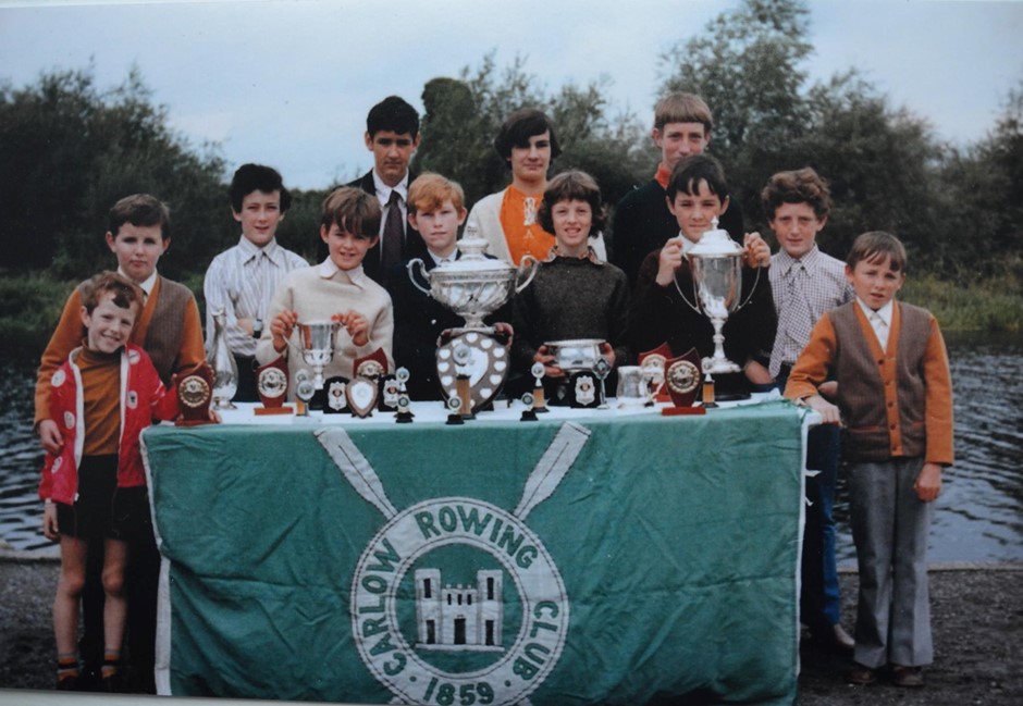 My earliest memories of Carlow Rowing Club go back to the early 1960s, when, as a young child growing up in Little Barrack Street, I was surrounded by rowing trophies of all shapes and sizes. To tell the truth, the weekly cleaning of them made sure I would either love or loath rowing history and memorabilia. The biggest trophy to find its way to our house was The Metropolitan Sculler’s Shield from Dublin Metropolitan Regatta (Junior Sculls), which stood in front of our fireplace in 1968. It made a fabulous fireguard. Rest assured, we never lit a fire, and it too received a weekly clean.