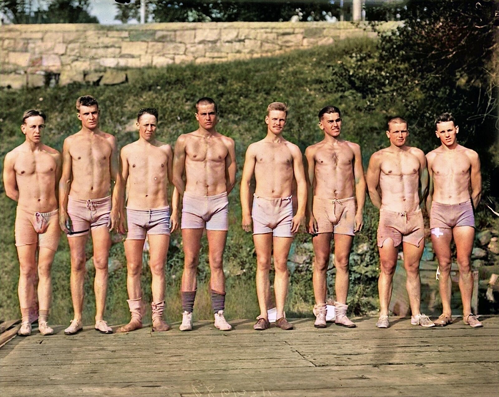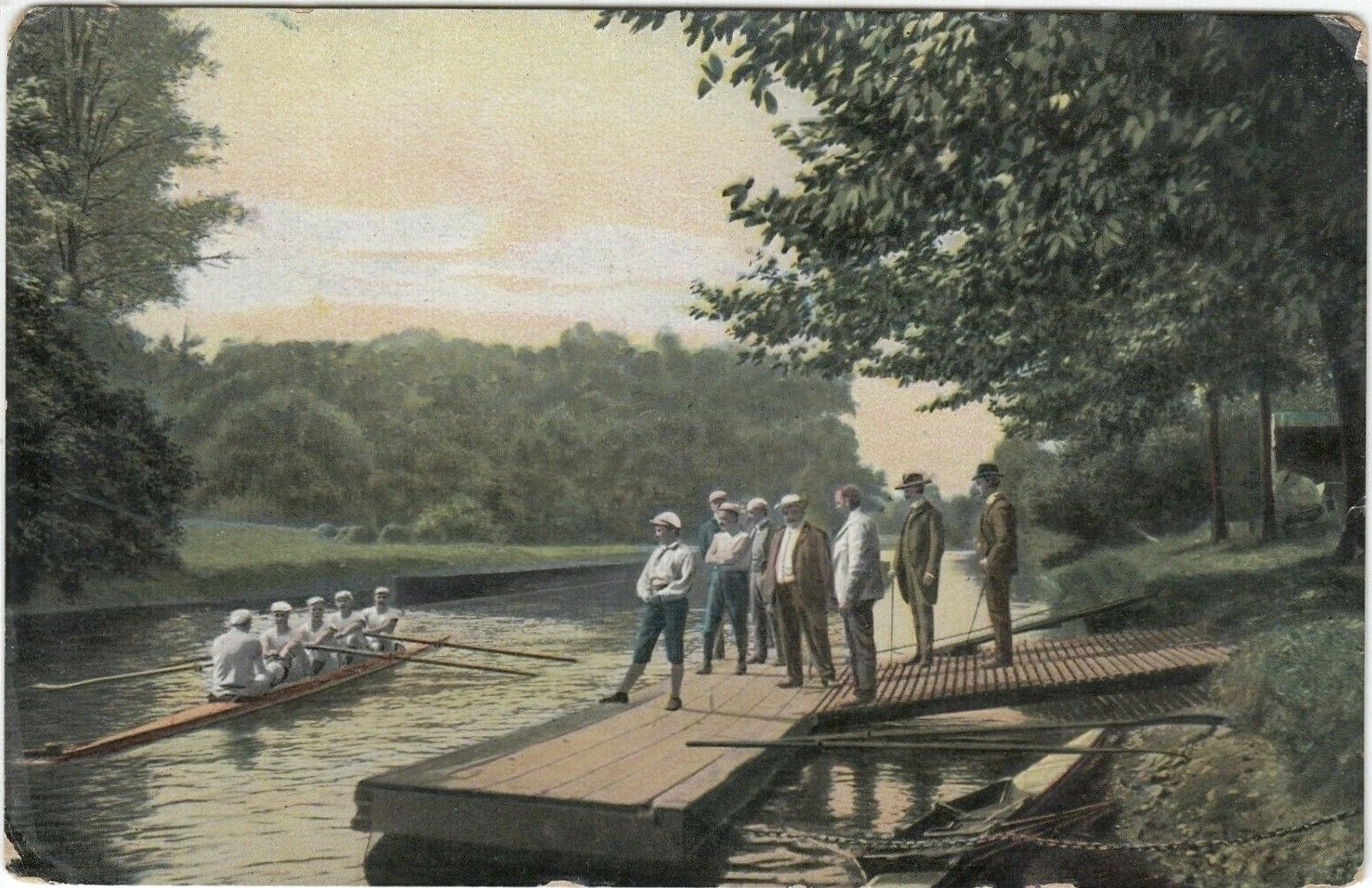 This charming but mysterious postcard of a probably early twentieth century rowing scene is for sale from an English dealer. However, based on the below-the-knee shorts and the style of the caps, I suspect that it may be German.
