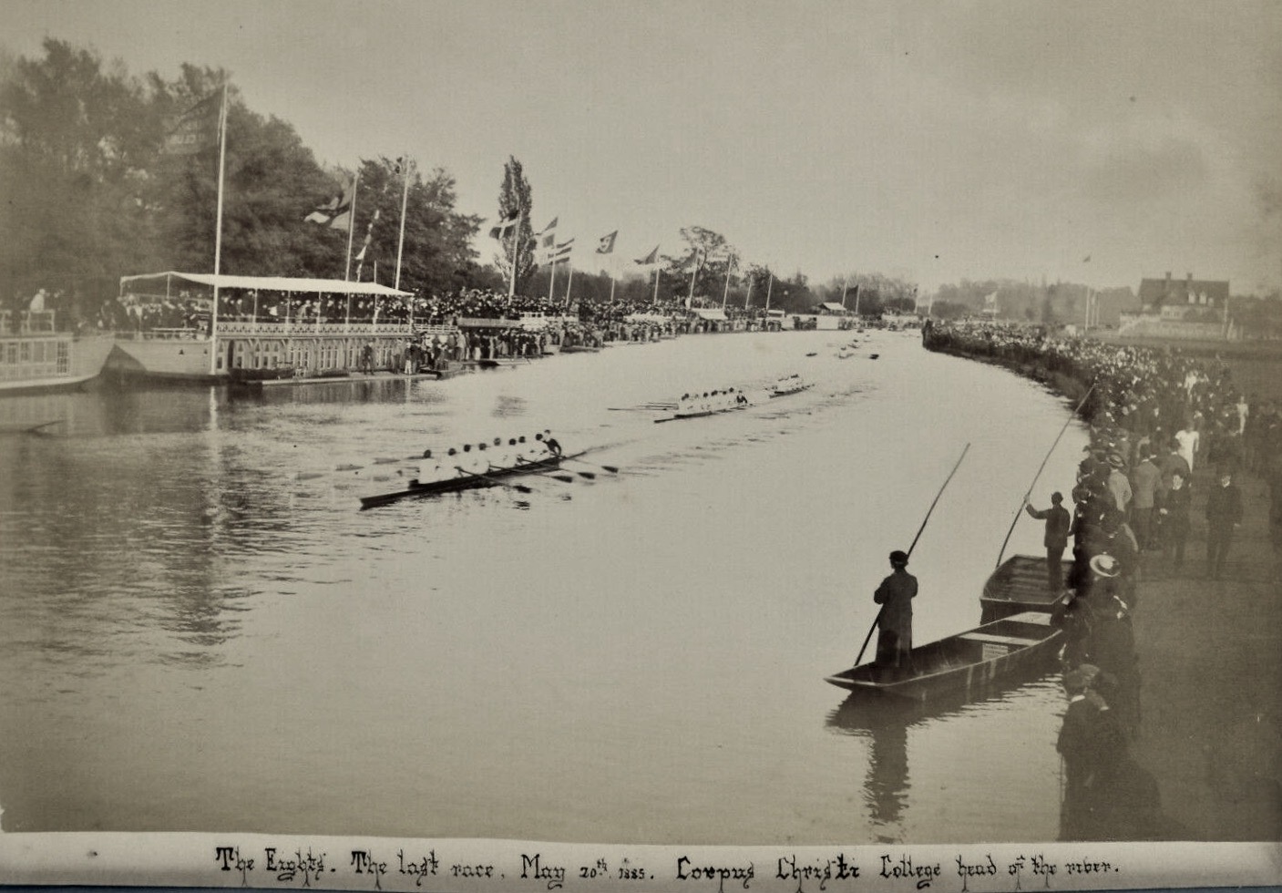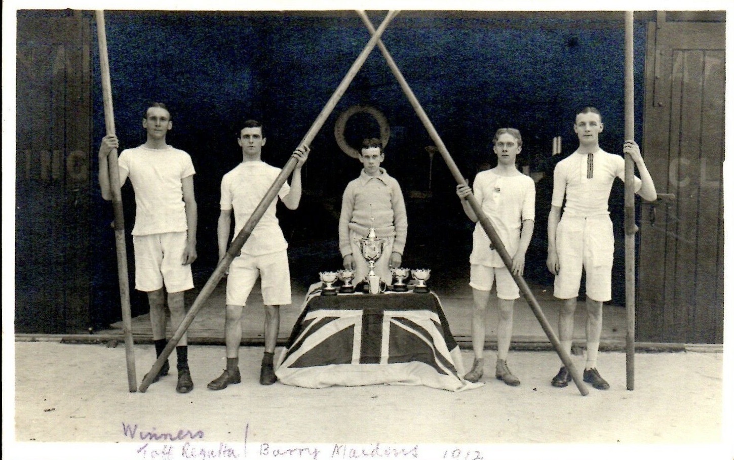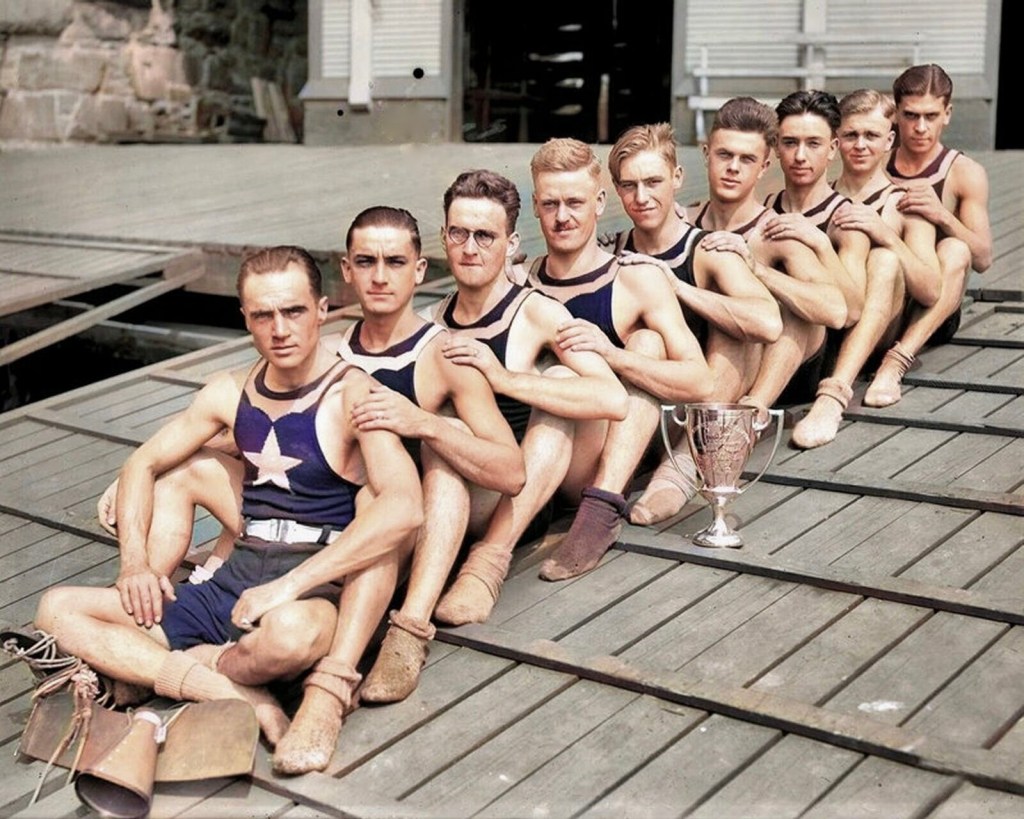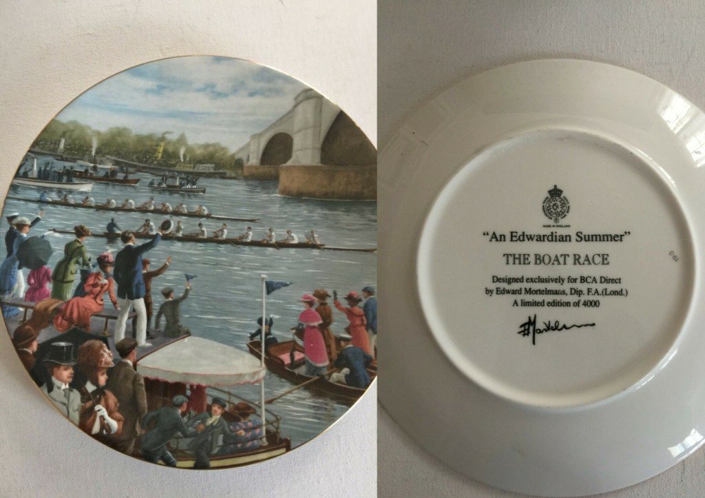 Yale 1911 shows us what they are made of.Potomac BC 1919 forgot their boat.A 1978 press picture of Dr Benjamin Spock taking his daily scull on Beaver Lake, Arkansas. Spock was the paediatrician and radical activist who wrote the enormously influential and later controversial “Common Sense Book of Baby and Child Care” (1946). In 1924, he was in the Yale crew that represented the U.S. in the Paris Olympic Eights and won Gold.Though not exactly “Daisy Dukes”, shorts for men in 1905 were still considered daring. “Honi soit qui mal y pense” is Old French and is usually translated as “shame on anyone who thinks evil of it”.A postcard from 1909 showing two heroes of the hour, winners of that year’s Boat Race. Oxford’s President, Alister Graham Kirby, later competed in the 1912 Olympics and died of illness on active service during the First World War. James Angus Gillan had previously rowed in the 1907 Boat Race and had won the Stewards’ and the Visitors’ at Henley and Gold in the four at the 1908 Olympics. Later, he won Henley’s Grand and Gold in the eight at the 1912 Olympics.A postcard showing Duke Street in Henley-on-Thames suitably decorated for the 1908 Olympic Regatta that was held over part of the Henley course.The first boat club for Cambridge’s Trinity College, Trinity Boat Club, was founded in 1825 and was open to all members of the college. After Third Trinity BC was started in 1833 for those in college who had attended Eton or Westminster, the original club became known as First Trinity. A well-supported local regatta sometime before the First World War. What was “FR & SC”?Another popular Edwardian regatta, this one on the Isle of Man.As the sign says, these sailors are members of the “Chippy Crew” photographed on 30 May 1939. The crew are, rowing historian Bill Lanouette tells us, at one of five boathouses that lined the Hudson River just south of Spuyten Duyvil, where the Harlem and Hudson rivers meet. George Washington Bridge is in the background.A German press photograph from 1938. The information on the back says that this shows the crew from the Berlin Rowing Club “Hellas” who won the “Adolf Hitler Fours” at the “Great Berlin International Rowing Regatta” on 26 June.A photograph showing Corpus Christi College going “Head of the River” in the 1885 Summer Eights at Oxford. The young men from Barry Rowing Club who won “Maiden Fours” at the Taff Regatta, Wales, in 1912.An early example of advertising using rowing to suggest that a food product promotes health and strength. “Liebig’s Extract of Meat Company” was an Anglo-German venture that was the originator of the “Oxo” products.This scene from “An Edwardian Summer” (sometime between 1901 and 1910) shows the Boat Race finishing at Chiswick Bridge – a span built in 1933. Too late to recall the other 3,999 plates?This promotional picture for the “Gyroducing” rowing exerciser of the 1950s indicates that it was more comfortable than today’s “Concept 2” type machines – even if a suit and tie had to be worn.