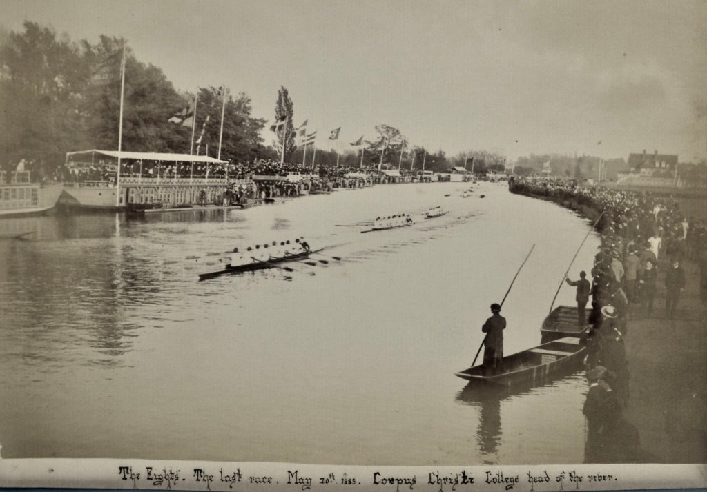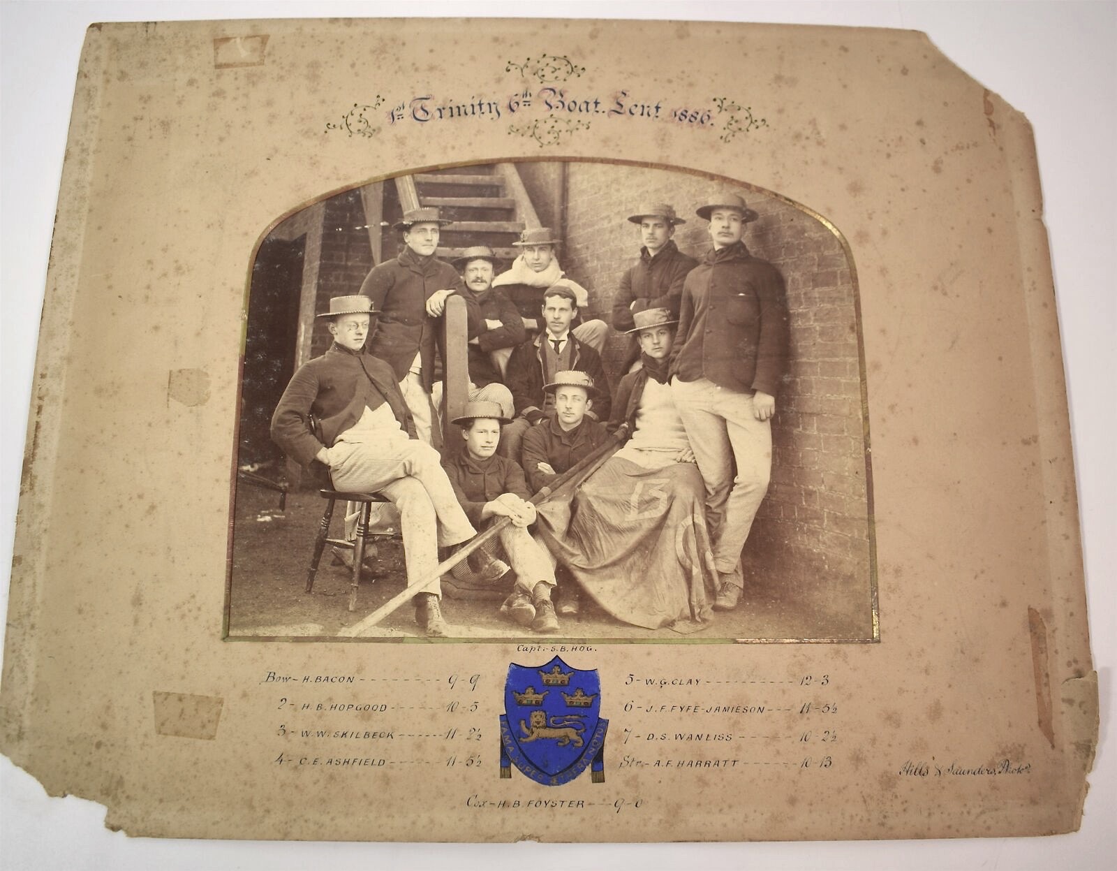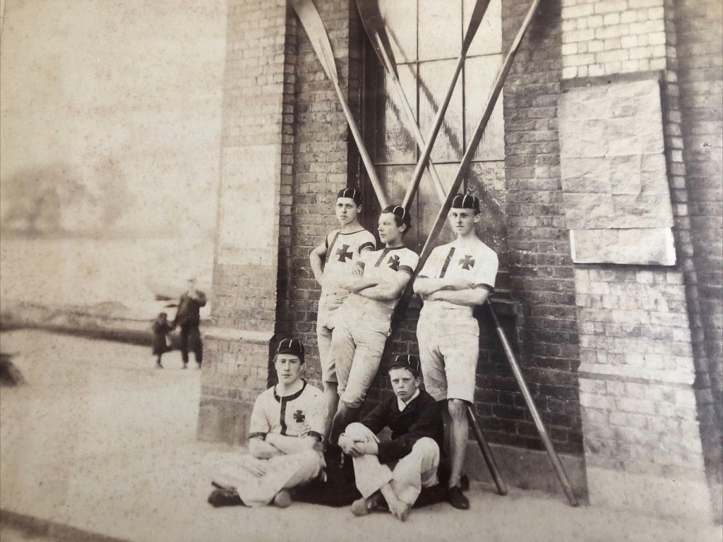 The seller knows nothing about this nineteenth century, possibly 1870s, photograph of these confident looking schoolboy rowers. Some sport an early example of the reversed cap look. The Maltese style crosses on their vests suggest that they could be from Radley College, the public (i.e., private) school near Oxford.