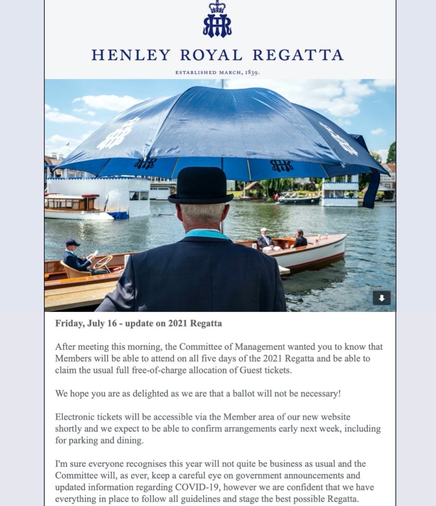 The second happy event of Friday, 16 July, was an email from Henley Royal Regatta to members of the Stewards’ Enclosure stating that they and their guests would have their usual access to the regatta this year. Earlier, there had been thoughts that even members may not be able to attend all five days and that places would have to be allocated by ballot.